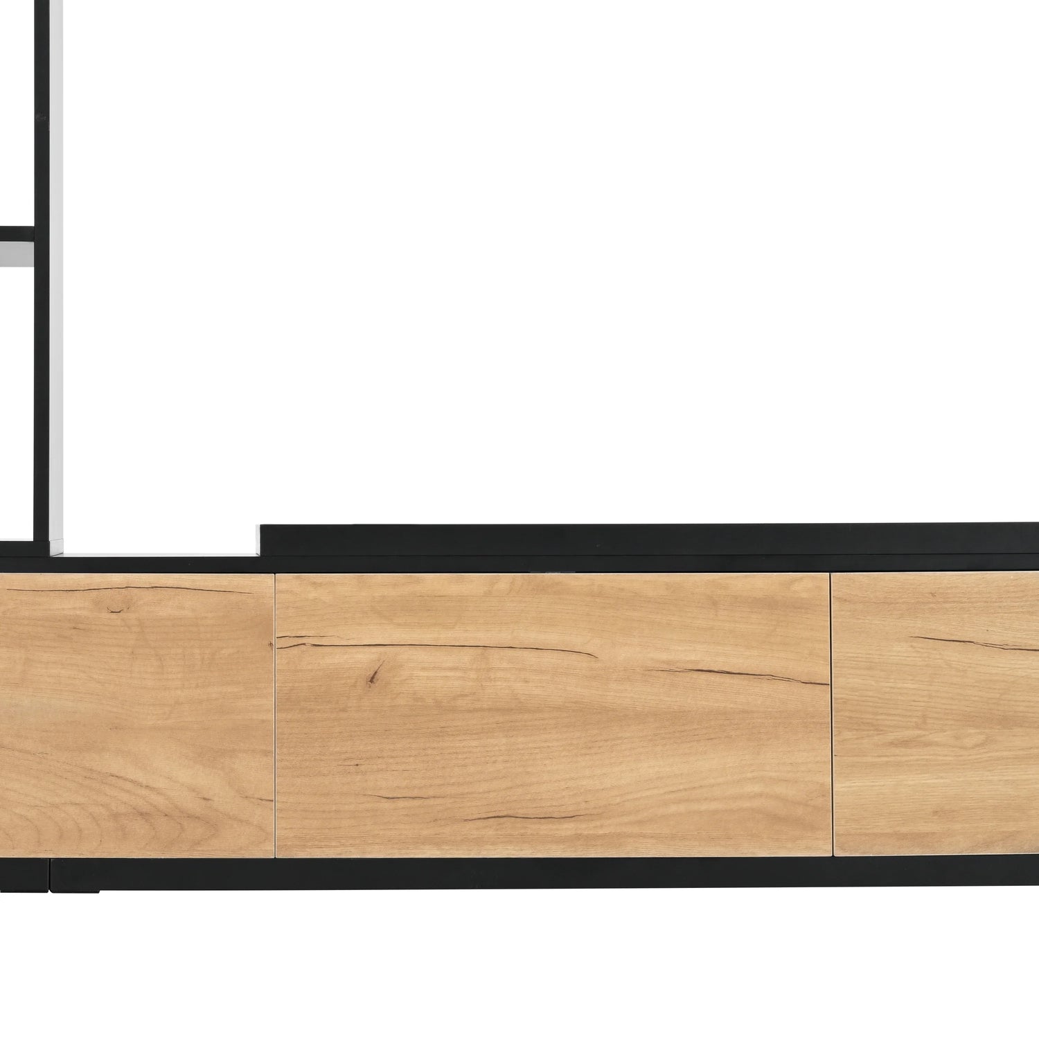 Perfect for modern living rooms where clean lines and practical storage matter, this low-profile TV stand with open shelves and three wood-front drawers pairs display space with concealed storage so media gear and living-room clutter stay out of sight. Its elongated silhouette and mixed open/closed layout make it suitable as an entertainment center, media console, or low sideboard beneath a wall-mounted TV.
