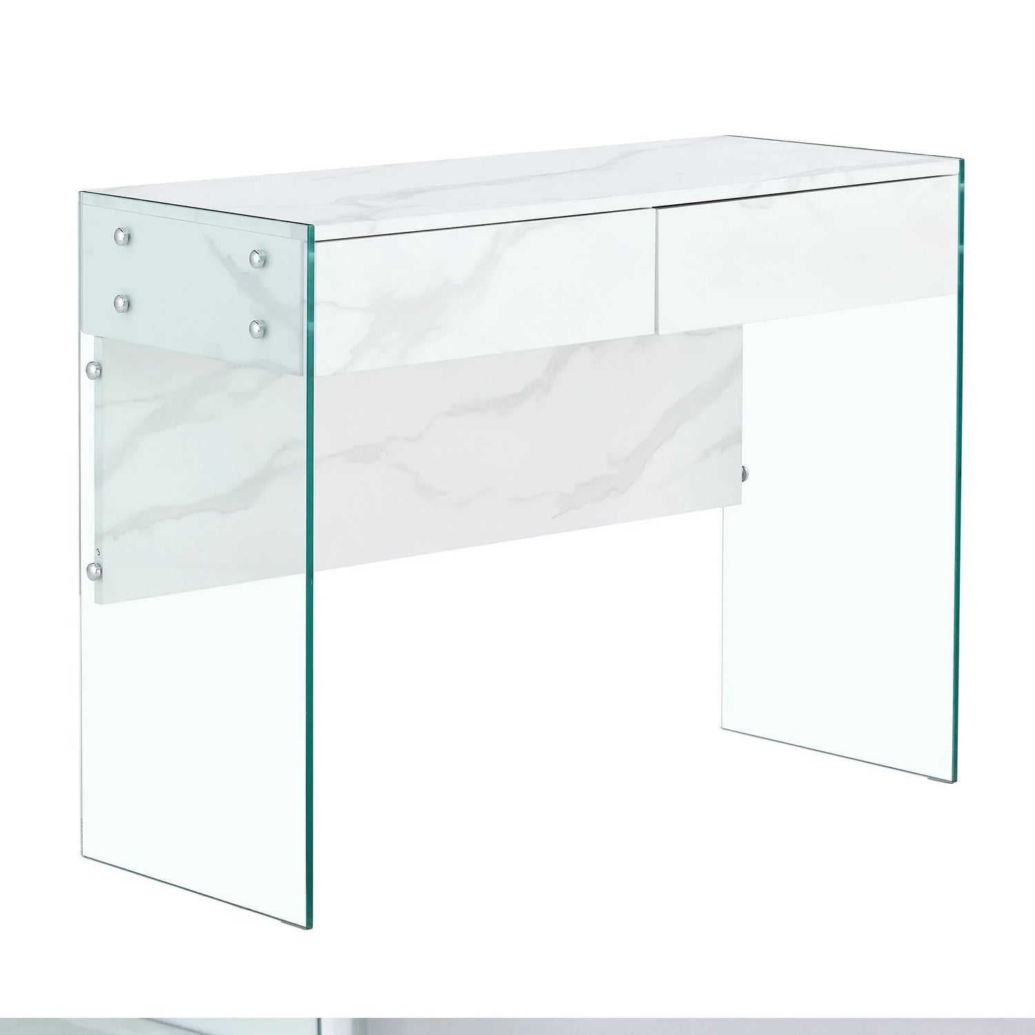 Everyday use is effortless thanks to two concealed drawers that keep cosmetics, work essentials, or tech accessories neatly stowed. The top features a white, marble-effect surface that reads refined against the clear tempered-glass leg panels — a contemporary mix of warm surface and cool, transparent structure that elevates modern and transitional interiors alike.