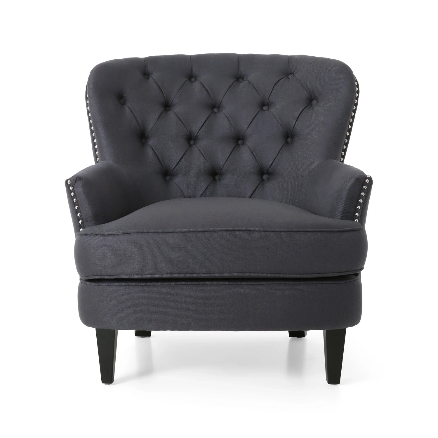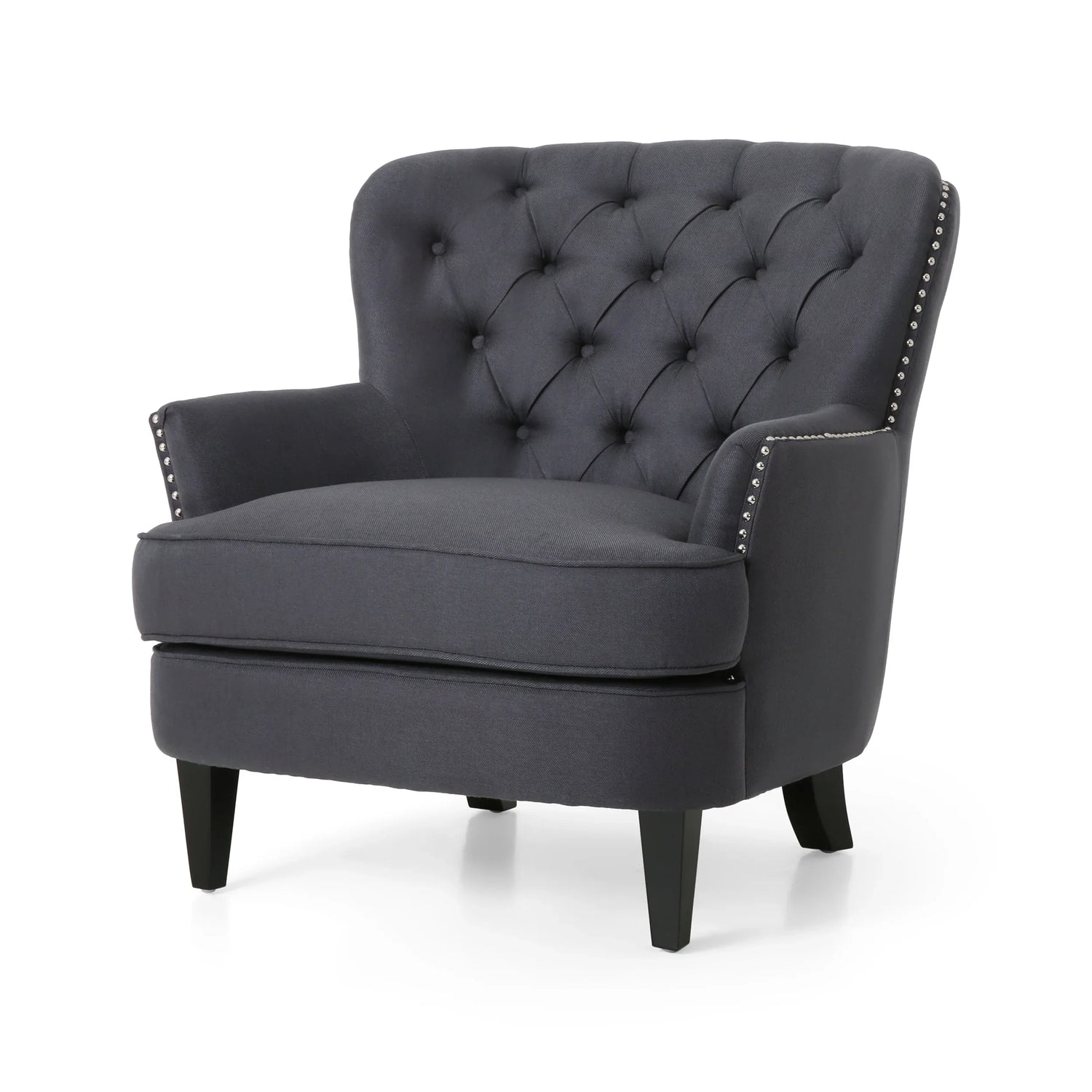 - Construction notes: Button-tufted back, padded seat cushion, decorative nailhead trim along arms.