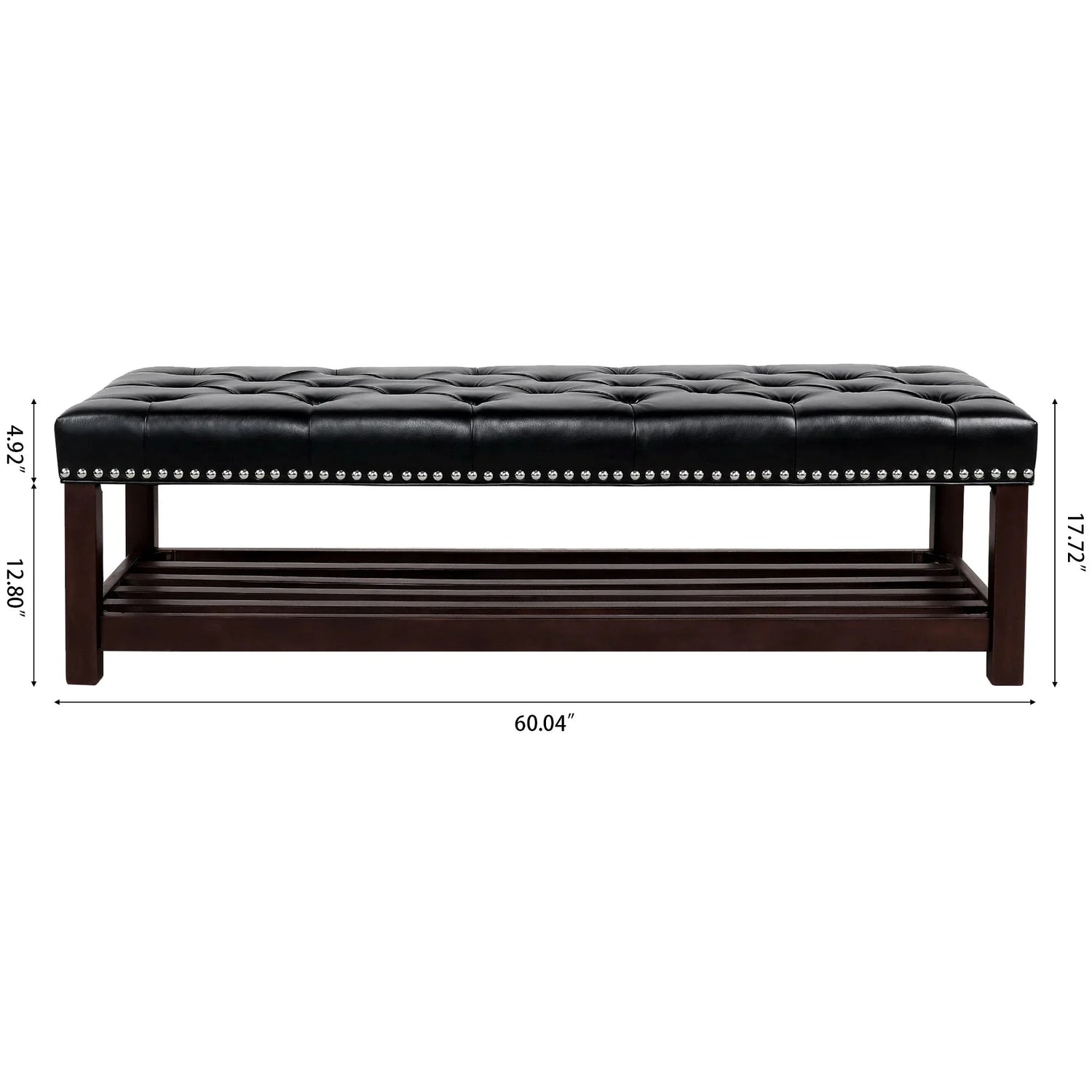 Upholstered in an easy‑clean PU leather with a plush sponge (foam) seat, the bench combines resilient comfort with visible, hand‑finished details: deep button tufting across the top, a line of decorative metal nailheads around the apron, and a sturdy wooden frame and lower slatted shelf that holds shoes or baskets. The result is a versatile, design‑forward piece that reads both traditional and transitional in most homes.