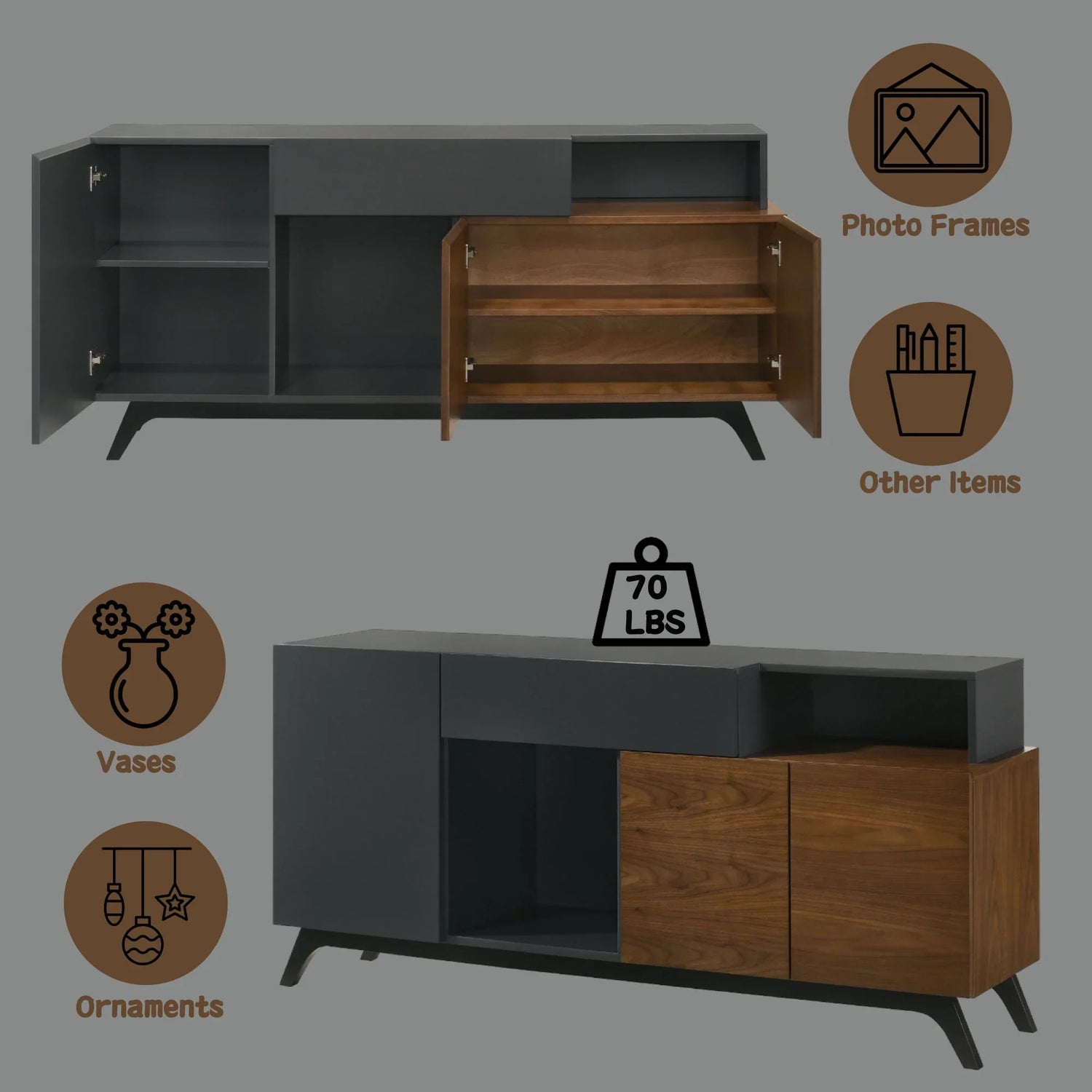 - Storage layout: multiple cabinet doors and an open cubby for display; smooth‑operating drawer with metal side glides, 2/3 extension and safety stop.