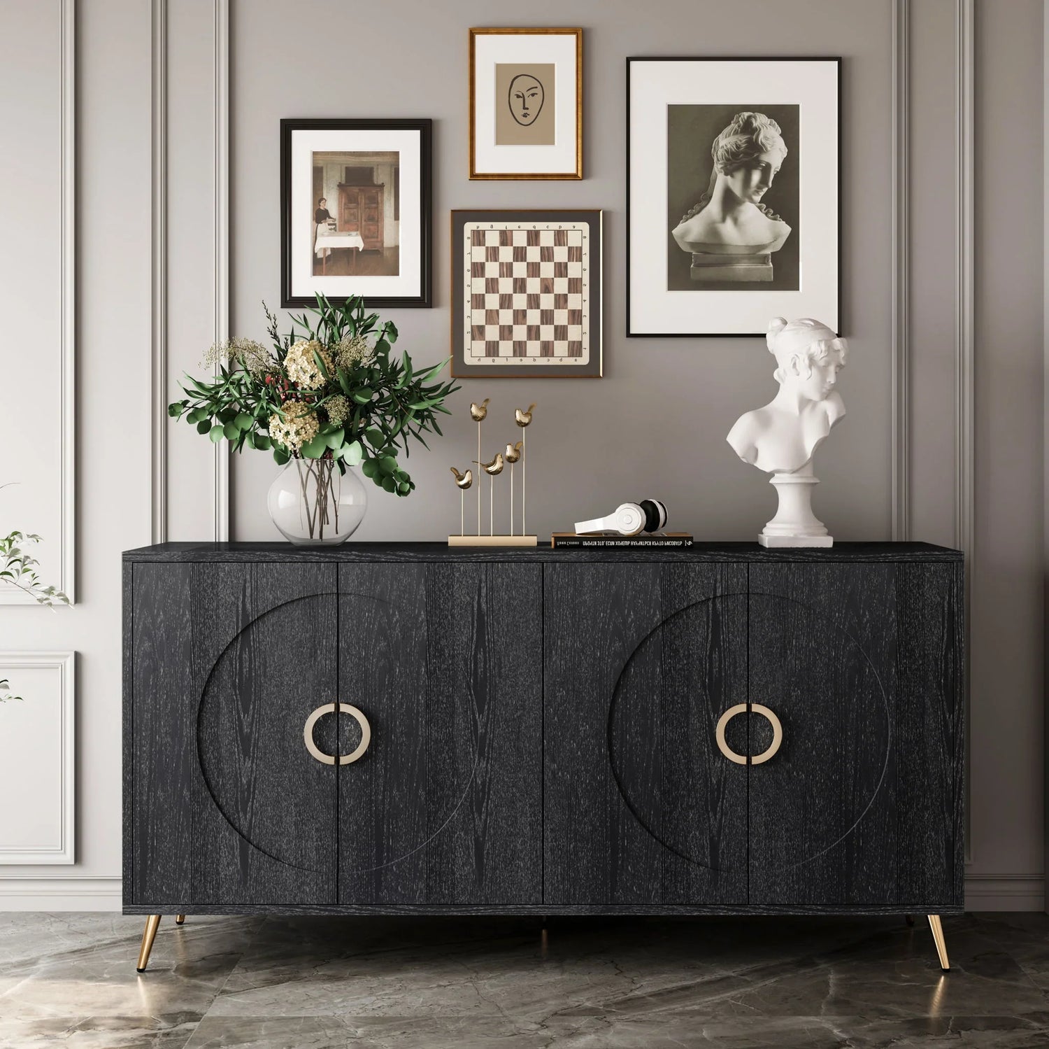Storage: Four doors provide generous enclosed storage suitable for dinnerware, linens, media components, or office supplies. Internal shelf configuration not specified — ideal for everyday household organization.