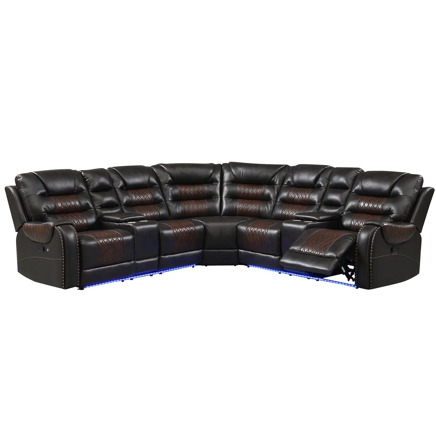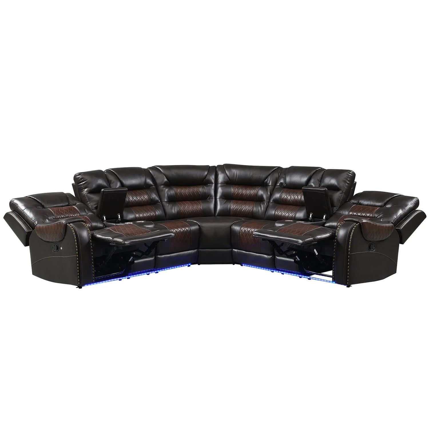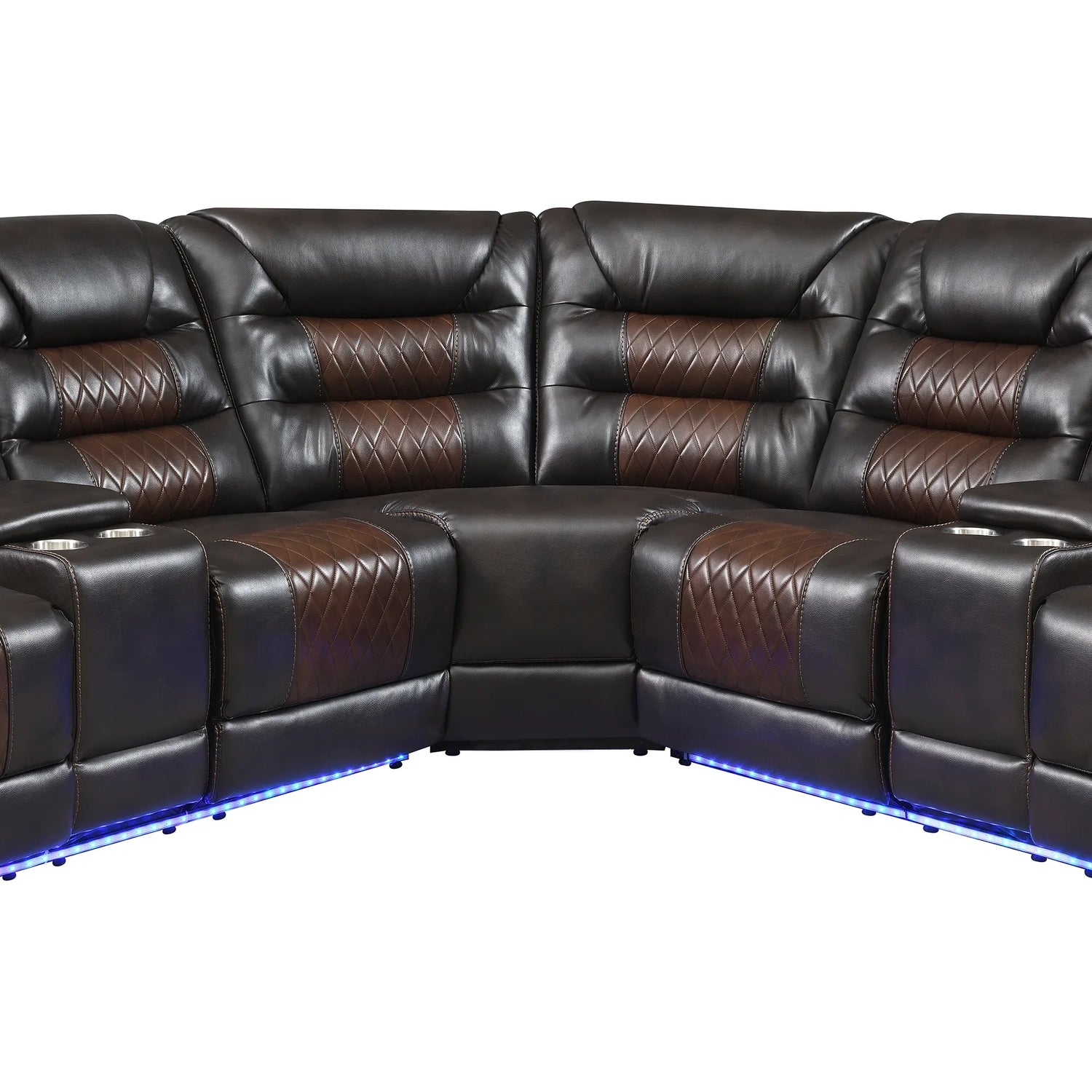 Everyday use is effortless: manual recline mechanisms let each end tilt back for lounging, while low-profile blue LED lighting along the base creates subtle ambient glow. Visible details—square arms with nailhead-style trim, diamond-quilted brown inserts on seat and back cushions, and a gently curved corner—give the sectional a tailored, modern look that pairs well with both transitional and contemporary interiors. Note: natural variation in faux-leather finish and screen color may occur.