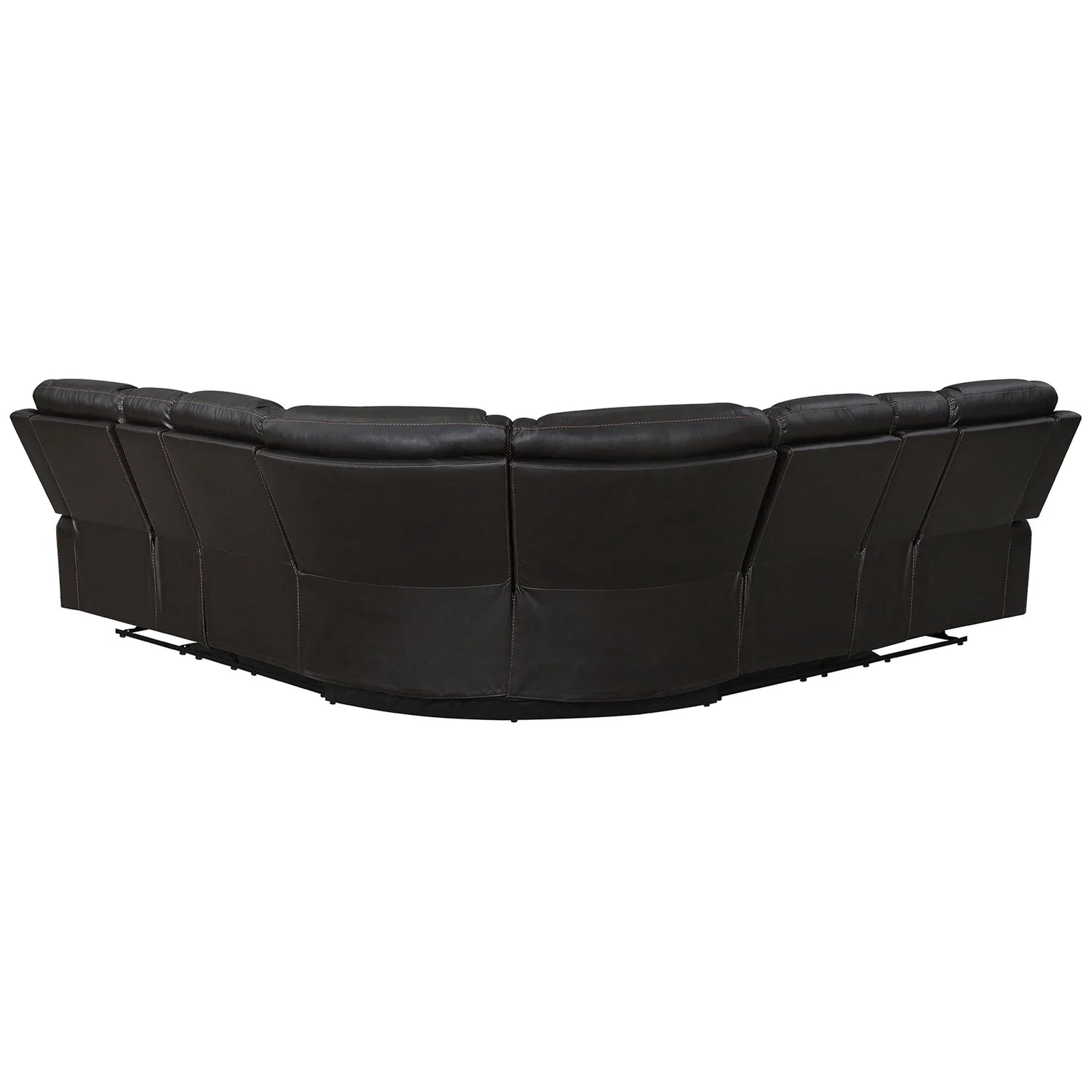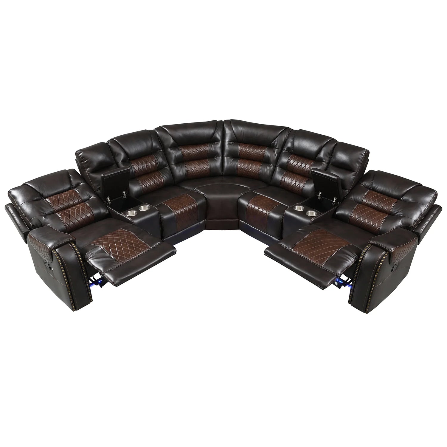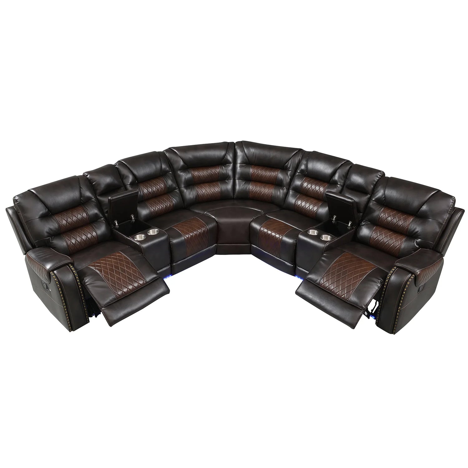 Designed for movie nights, family living rooms, or a modern home theater, this curved sectional sofa with manual recline and integrated LED lighting balances roomy comfort with contemporary style. Upholstered in black-and-brown PU leather with quilted accent panels and plush foam fill, it seats up to five and reads as a centerpiece for relaxed, tech-friendly living spaces.
