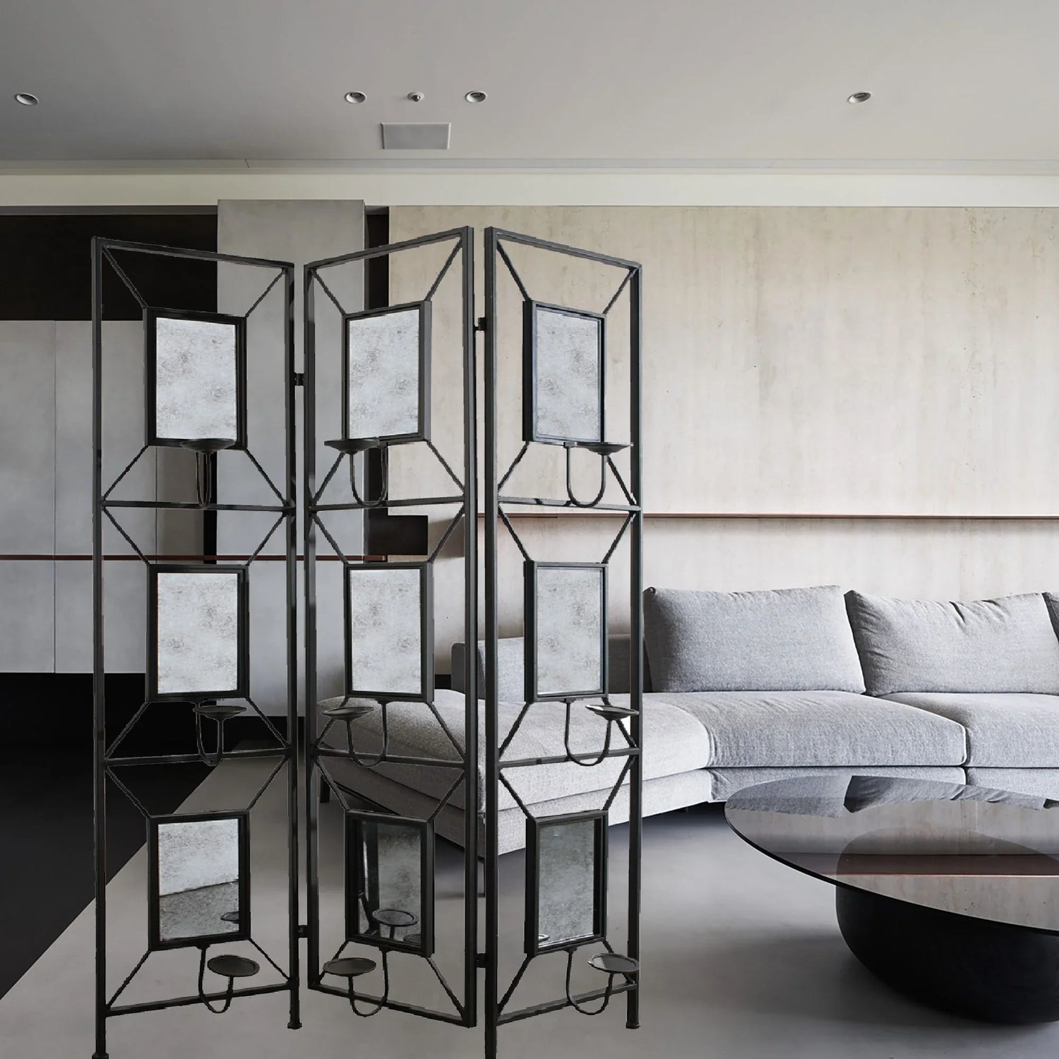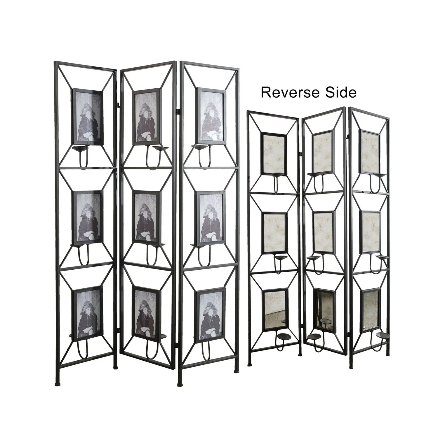 Room Photo Frames Screen Divider Screens, 3 Panel Decorative Screen With Photo Frames, Antique Mirror, Candle Stick - Black