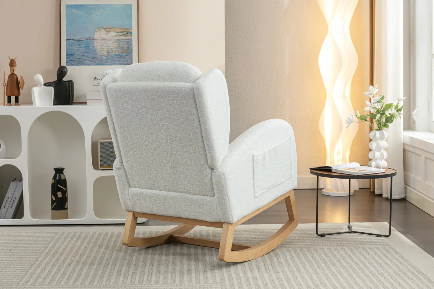 - Design & Material: This rocking chair features an ergonomic backrest and is crafted from teddy fabric material with a sturdy wooden frame and legs, ensuring both comfort and durability.