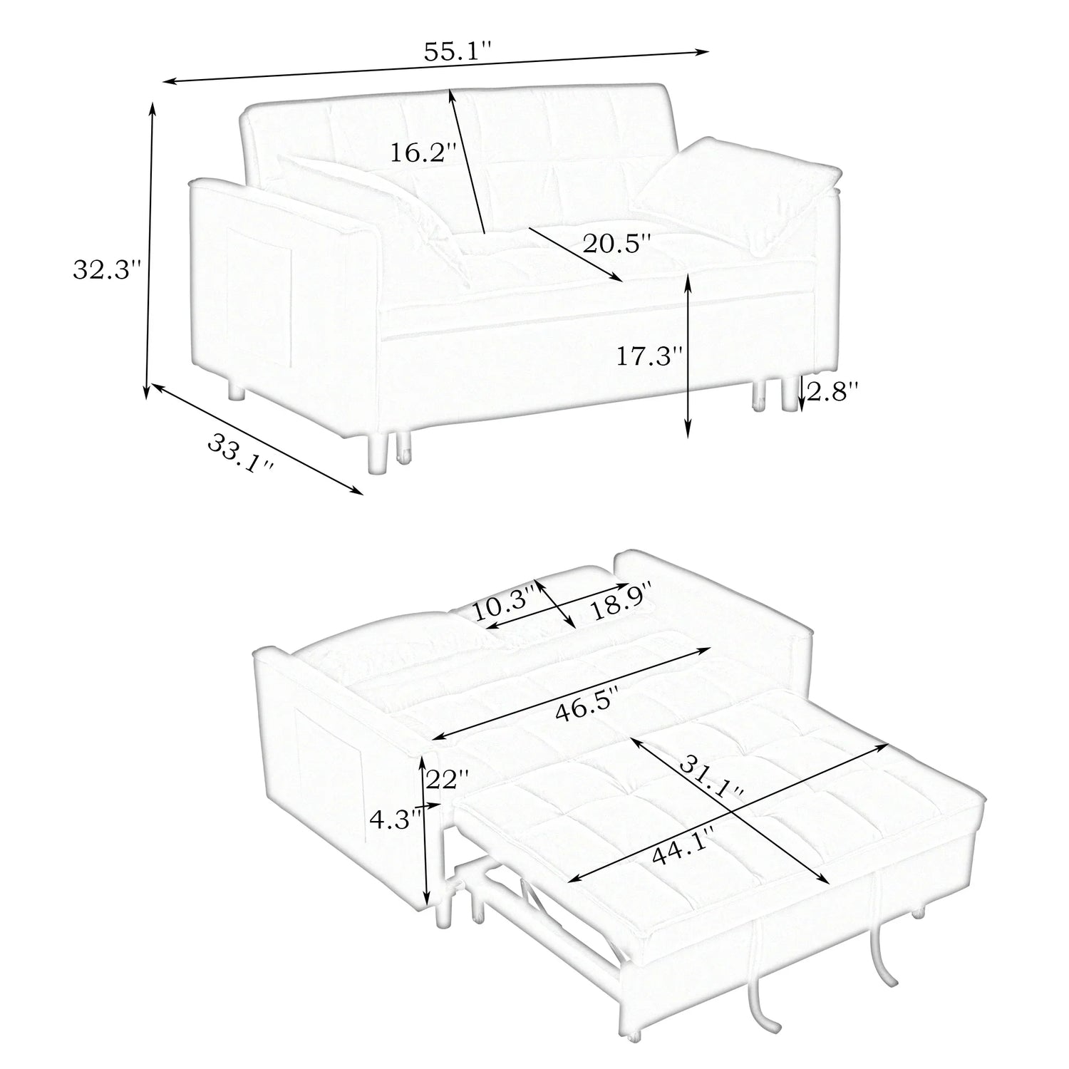 The loveseat includes a solid slatted bed frame for stable support; a mattress is required for sleeping use (not included). Measure openings before delivery—overall width is 54.3" (137.9 cm), so most homes will need to turn or angle the piece through doorways narrower than that width. Use caution when converting the unit and avoid placing heavy loads on the pulled-out frame beyond normal mattress use.