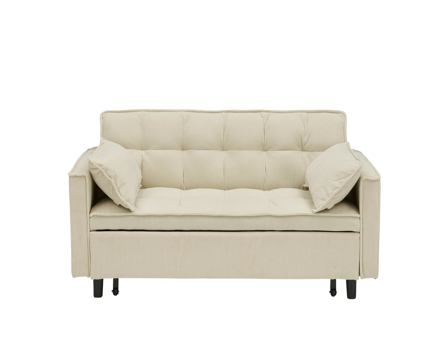Upholstered in a breathable beige corduroy with subtle ribbed texture, the design pairs clean, modern lines with cushioned comfort. Tufted seat and back panels and two matching toss pillows give a tailored look, while the hidden pull‑out mechanism keeps the profile streamlined when used as a sofa. Mattress not included.