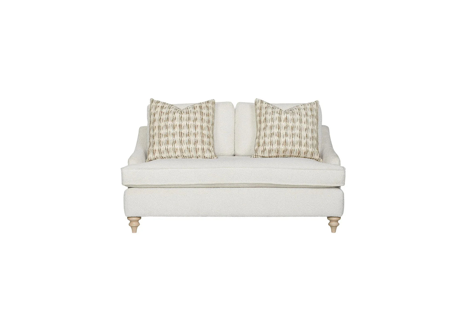 Every seat cushion is wrapped in Dacron for a soft, resilient feel that keeps its shape over time, while the padded exterior and turned wood legs add a subtle layer of refinement. Two included throw pillows introduce a woven texture that complements the boucle-like upholstery, making the loveseat an easy anchor for layered rugs, natural woods, and muted accent colors.