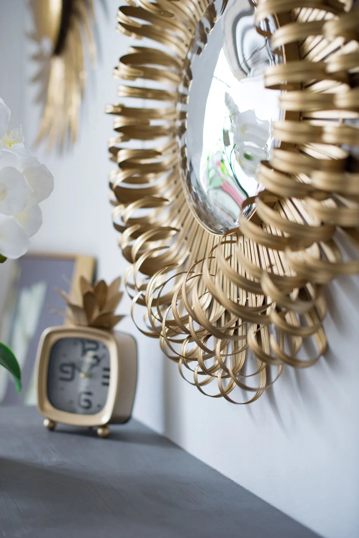 - Design: Features a sunburst design with a decorative golden finish, ideal for entryways and modern living rooms.