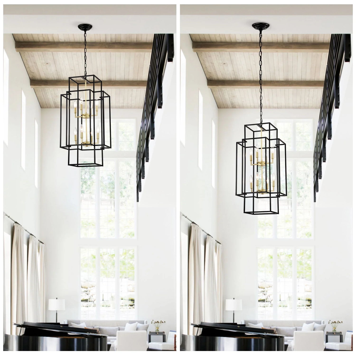 - Bold lantern silhouette that defines tall spaces without overwhelming them.