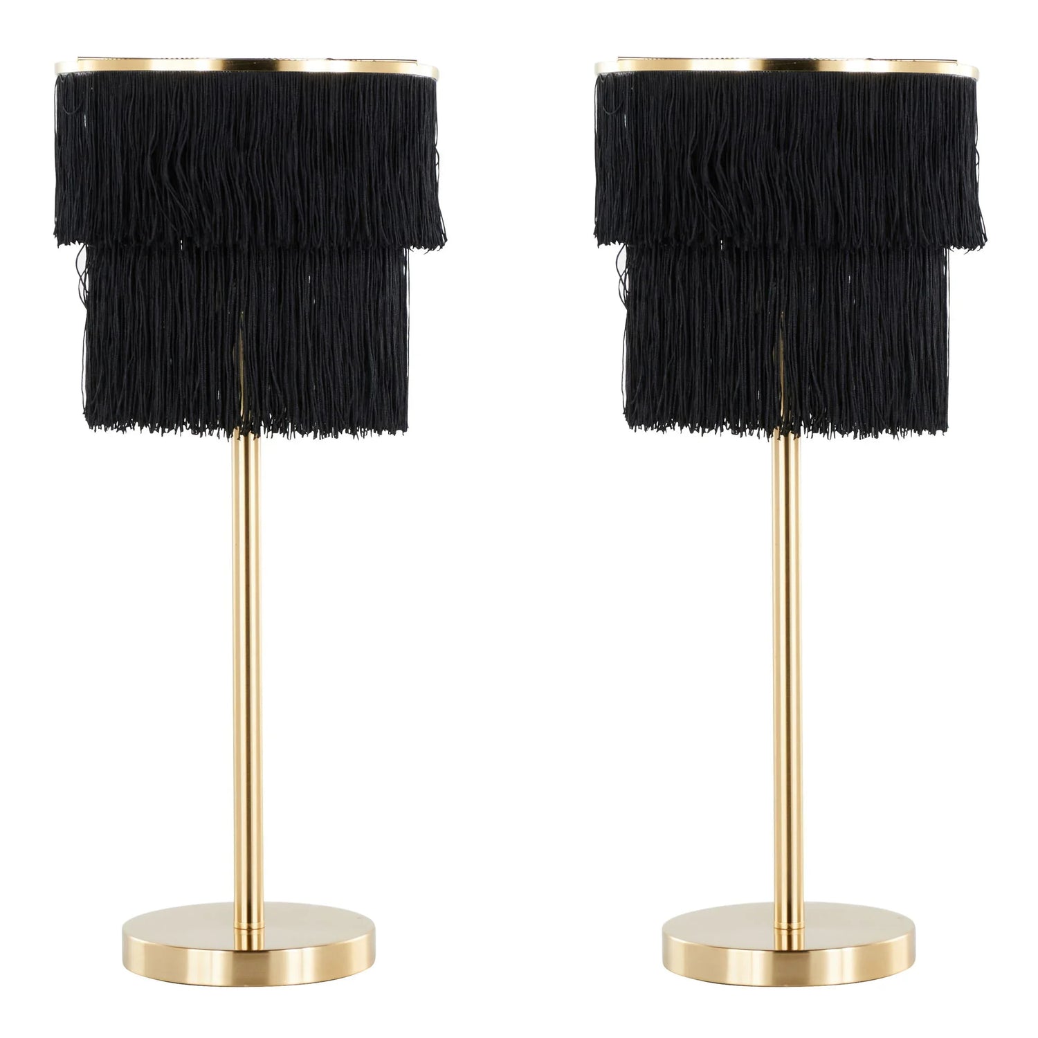 The Fringe Buffet Lamp (set of 2) is designed for style-forward living rooms, entryways, and hotel-inspired bedrooms where a touch of glamour meets everyday function. Each lamp pairs a slim, polished gold metal stem and base with a layered black fabric fringe shade that adds movement and soft, theatrical diffusion to bedside tables or console surfaces.