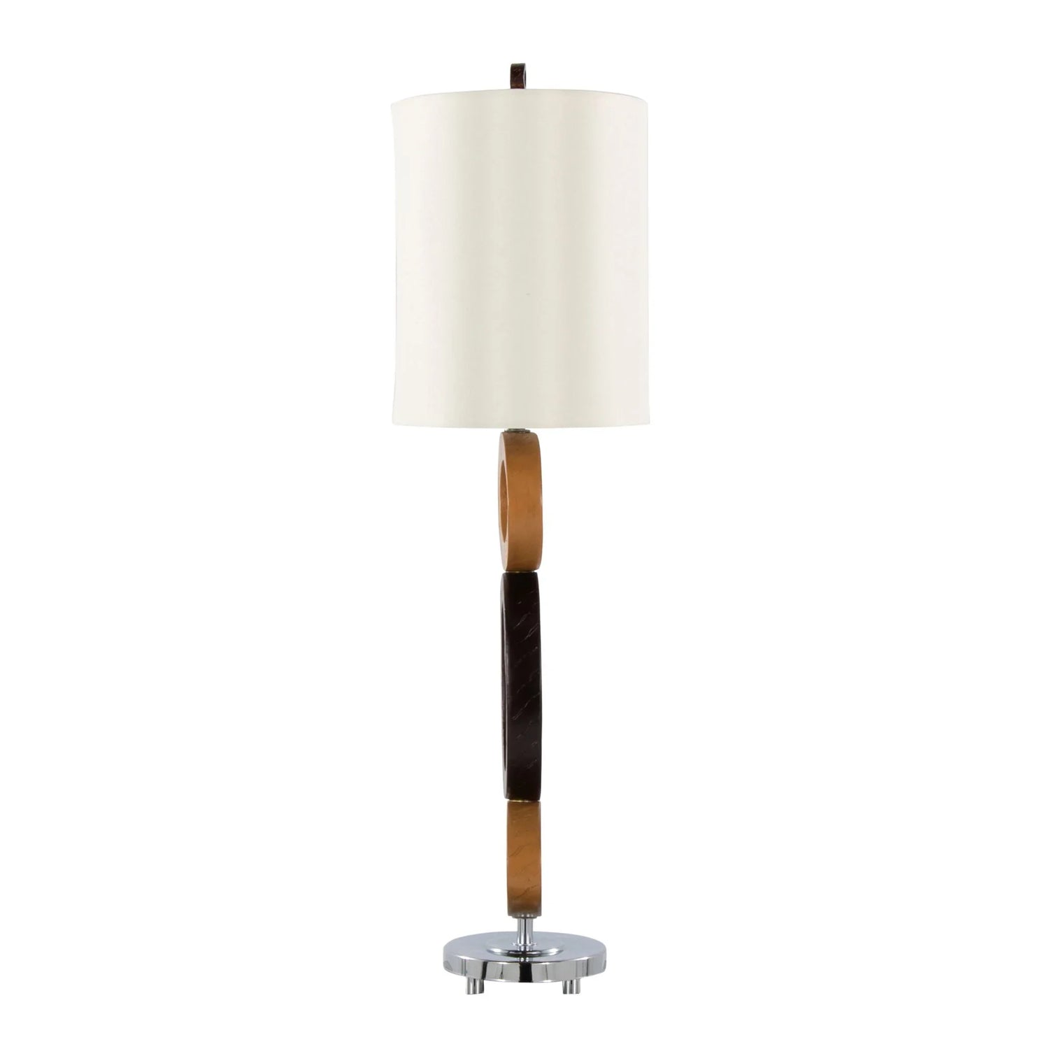 This lamp combines natural wood elements with metal hardware. Because this is a freestanding table lamp, place it on a stable surface and avoid locations where it may be easily knocked over; use an appropriate bulb type and wattage as recommended by the product label. Keep cords clear of walkways and away from heat sources. Natural variations in wood grain and finish are normal and contribute to the product's unique look.