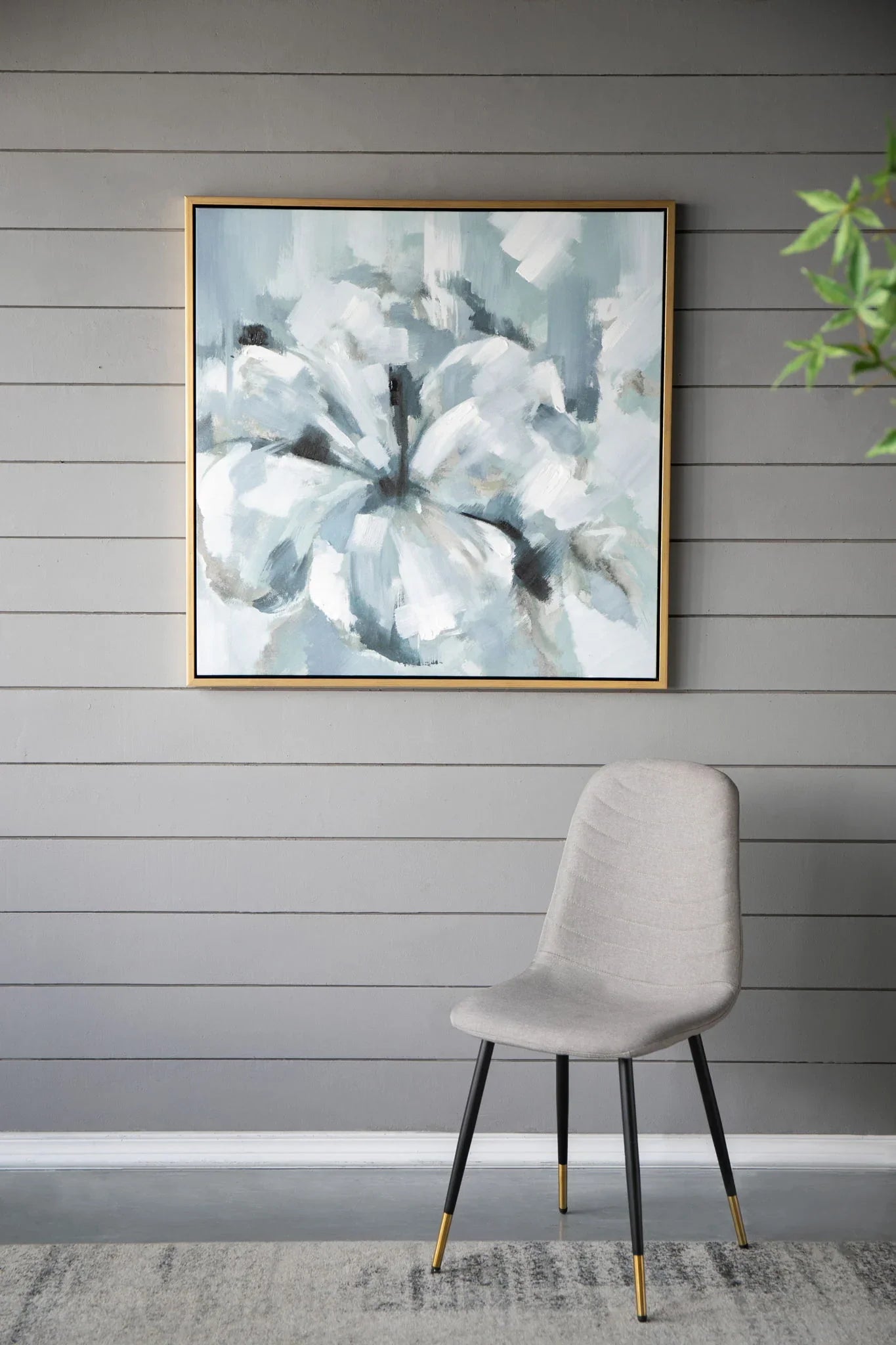 - Design: Features a modern flower oil painting with a square gold frame, combining blue and grey tones for a contemporary look.