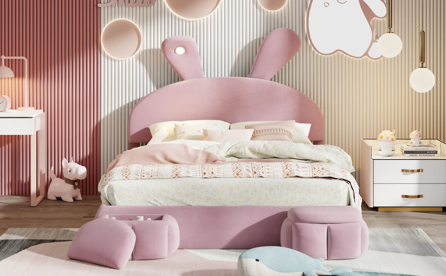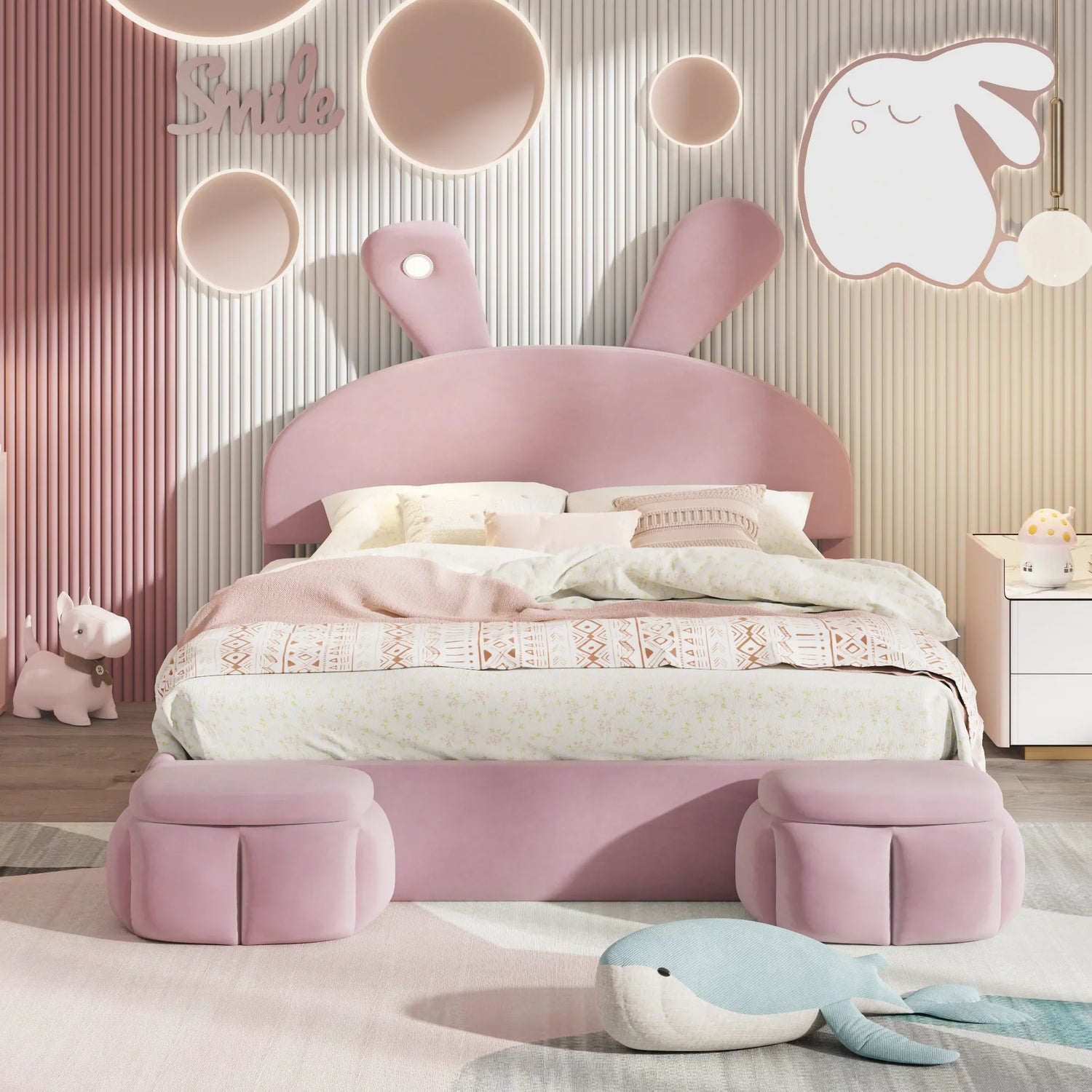 - Add a touch of whimsy to your child’s bedroom with this adorable platform bed, featuring playful cartoon ear-shaped accents and soft upholstery that you and your little one will love. One of the "ears" is equipped with a built-in LED light, perfect for bedtime reading, with adjustable intensity controlled by a switch. The cozy velvet-upholstered headboard enhances comfort, making mornings and evenings feel extra special. For added functionality, two small storage stools at the foot of the bed offer space for toys or bedding, with lids that keep contents dust-free. Easy to assemble with a clear manual and pre-drilled holes, this charming bed is a practical and delightful addition to any child’s room.