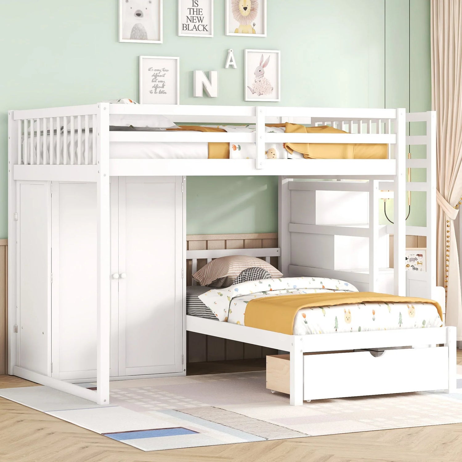Full Over Twin Bunk Bed With Wardrobe, Drawers - White