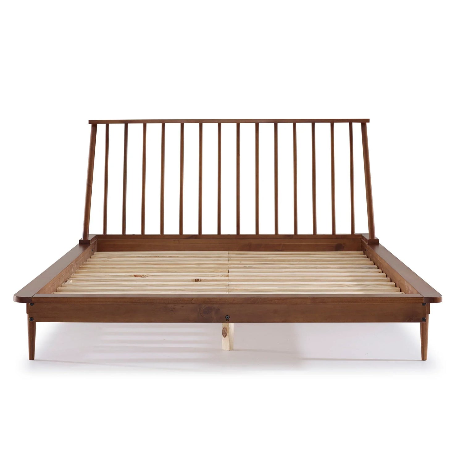 Mid-Century Modern Solid Wood Queen Platform Bed Frame With Spindle Headboard - Walnut