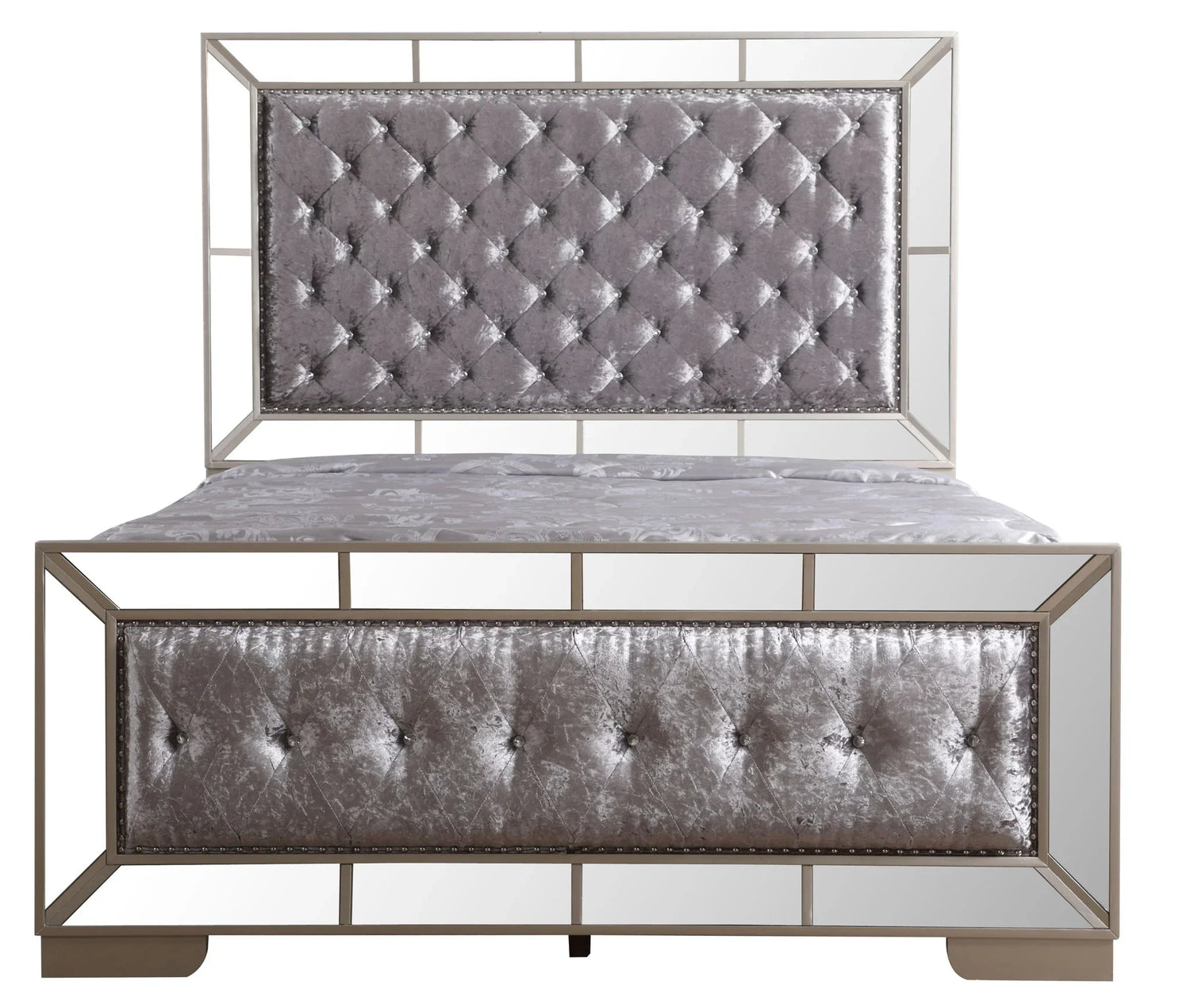Construction & materials: Upholstered headboard and footboard in padded faux leather with diamond tufting and decorative button details; mirrored trim and faceted mirror panels on headboard and footboard provide the contemporary accent. Exact frame materials and mattress compatibility vary by SKU.