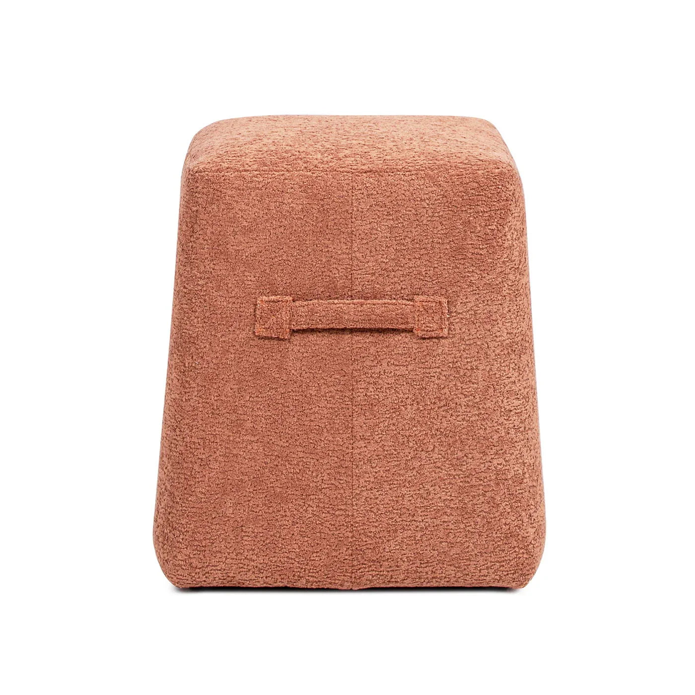 Upholstered in a textured performance-style fabric, Clyde works as a casual extra seat, a place to rest your feet, or a low side surface for a tray. Built to be both functional and decorative, it reads as a sculptural accent—simple stitching lines and a subtle handle detail add usability without visual clutter. Shown here in a warm terracotta-orange upholstery, the piece brings a pop of color and soft geometry to neutral or layered interiors; natural light and screen settings may cause slight variation in tone.