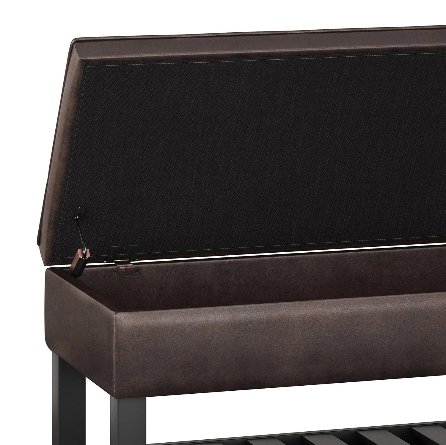 Built by hand from solid wood and plywood with a foam-padded lid upholstered in durable vegan faux leather, this bench balances resilient construction with soft comfort. The lift-up top uses a child-safety hinge to prevent slamming, and the open slat bottom shelf adds extra, easy-access storage—ideal for shoes or baskets. Assembly is required and the design is made to perform as both seating and practical storage in busy homes.