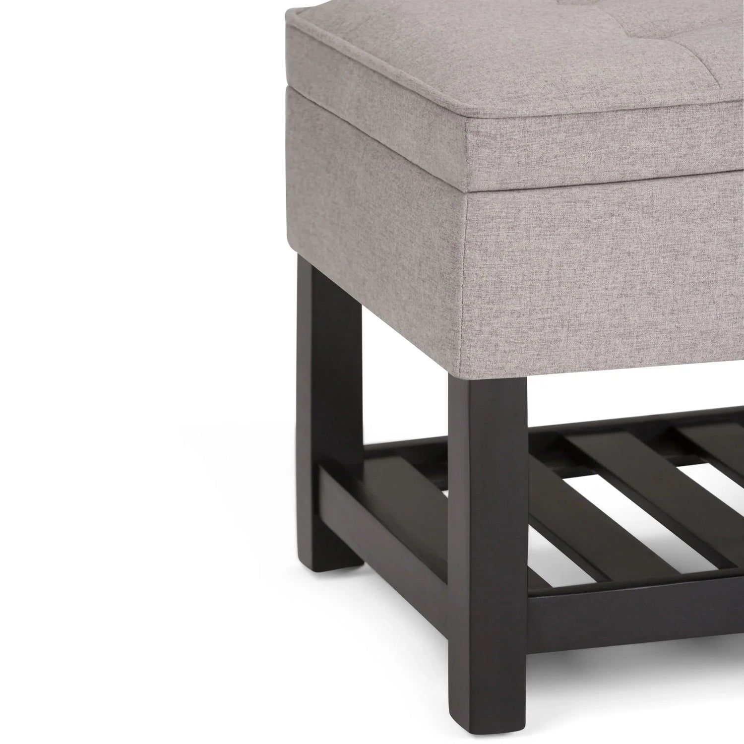- Design features: Tufted cushion top; straight square legs and slatted lower shelf for a clean, transitional look.