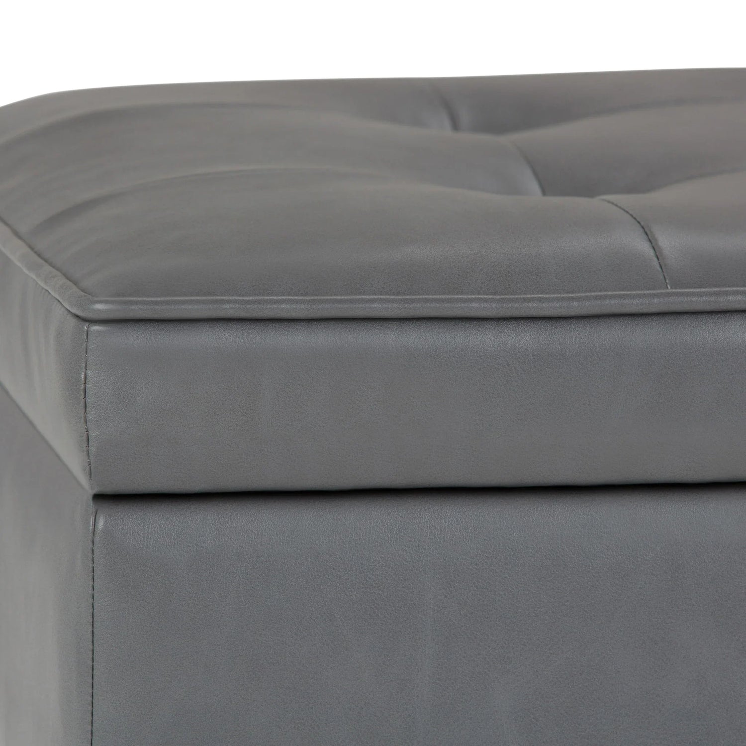 Place the bench at the foot of a bed to add seating and conceal extra bedding, or use it in an entryway with a slim tray or wall mirror above to create a functional landing zone. The tufted top and neutral faux leather finish pair well with woven rugs, wooden accent tables, and matte metal hardware for a cohesive, lived-in look.