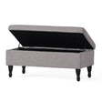 • Versatile Grey Fabric Ottoman – Upholstered in soft grey fabric, this ottoman offers seating comfort, concealed storage, and chic dark wooden legs for any room.
