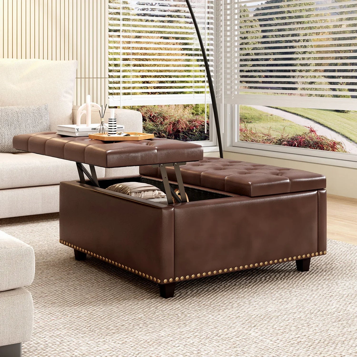 Use this ottoman as a central coffee‑table alternative in smaller living rooms: top it with a shallow tray to hold drinks and decor, or place it in front of a sectional for extra seating and concealed storage. Its tailored tufting and nailhead trim pair well with neutral sofas, woven rugs and mixed‑metal accents for a modern‑transitional look.