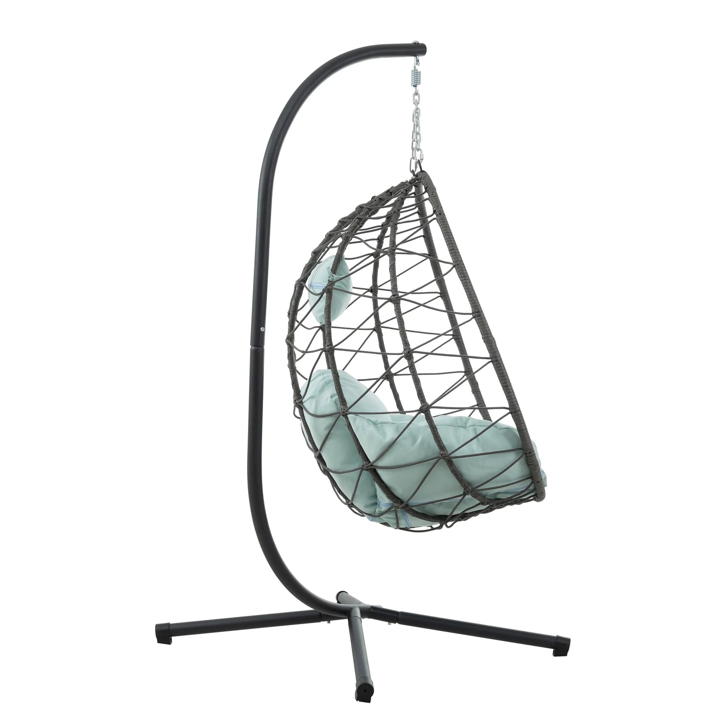 This hanging egg chair with stand is for anyone who wants a cozy, sculptural seating spot in a living room, sunroom, or covered patio. Its suspended egg silhouette cradles you for reading, lounging, or a relaxed conversation corner—perfect for apartments, family rooms, or outdoor-covered retreats where a single statement chair can define the space. The foam-green cushions add a fresh, airy touch against the darker woven shell for an easy modern look.