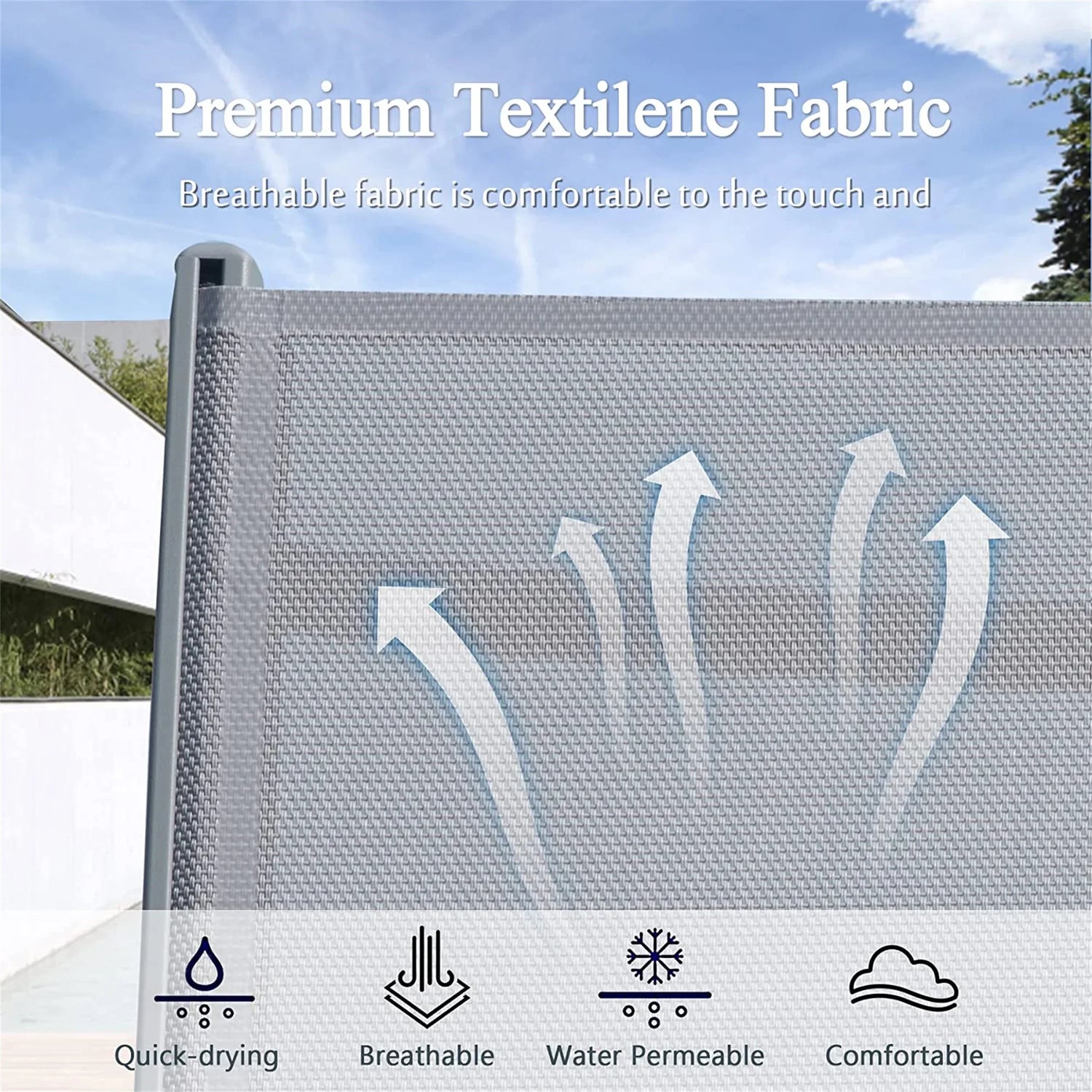 Perfect for poolside lounging, a sunny balcony, or a roomy patio, this Chaise Lounge Outdoor Set of 2 is made for anyone who wants low-maintenance comfort with a contemporary profile. The slim, arched aluminum frame and breathable grey sling create a clean, modern silhouette that fits coastal, contemporary, and minimalist outdoor schemes. Each chaise supports relaxed reclining, reading, or sunning while keeping a neat footprint.