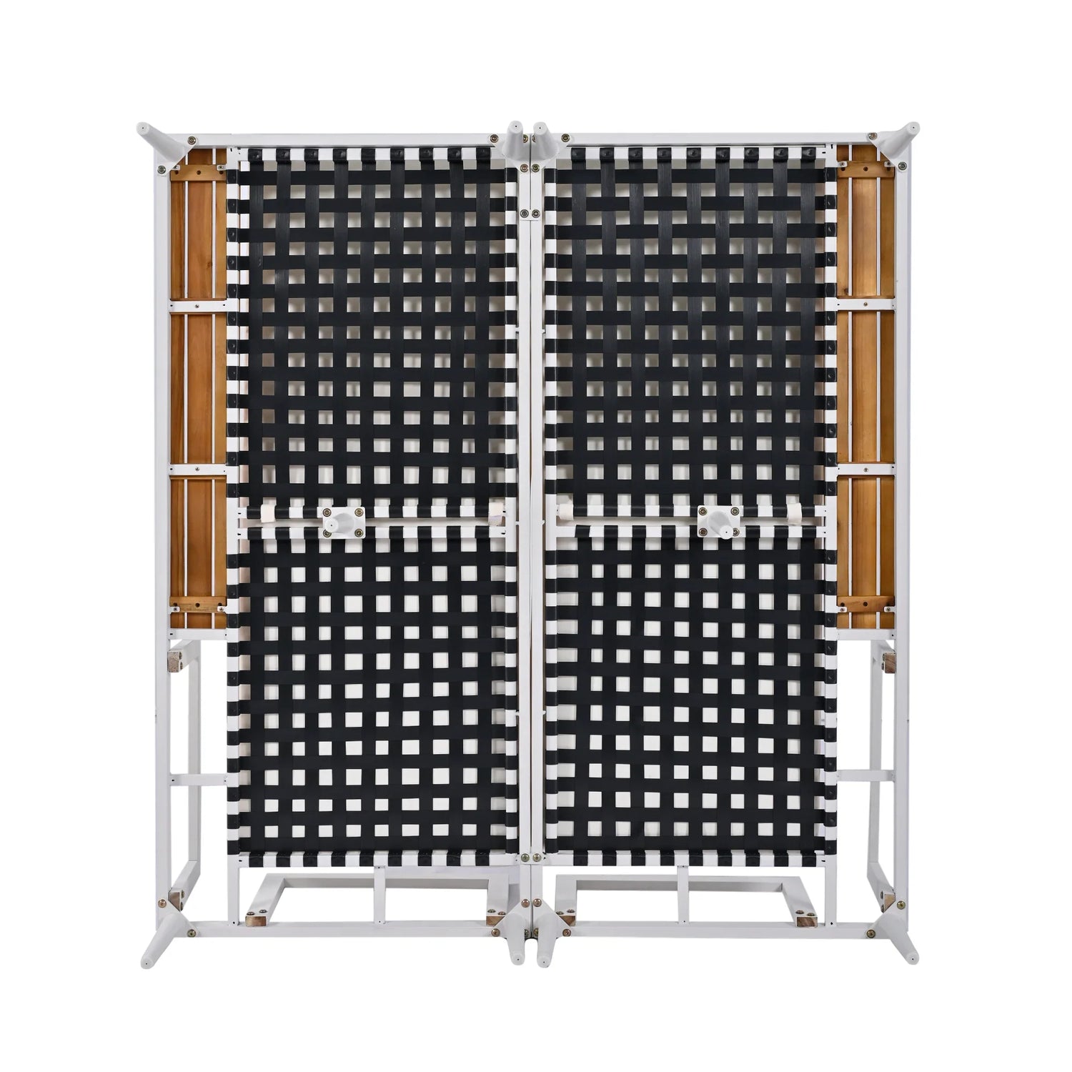 The frame is described as weather resistant; for safety, place the lounge on a level, stable surface and avoid placing heavy objects on the wooden tray. As with all outdoor furnishings, monitor exposed wood and hardware for wear and re-treat or tighten fittings as needed over time. No specific certifications or weight capacity were provided.