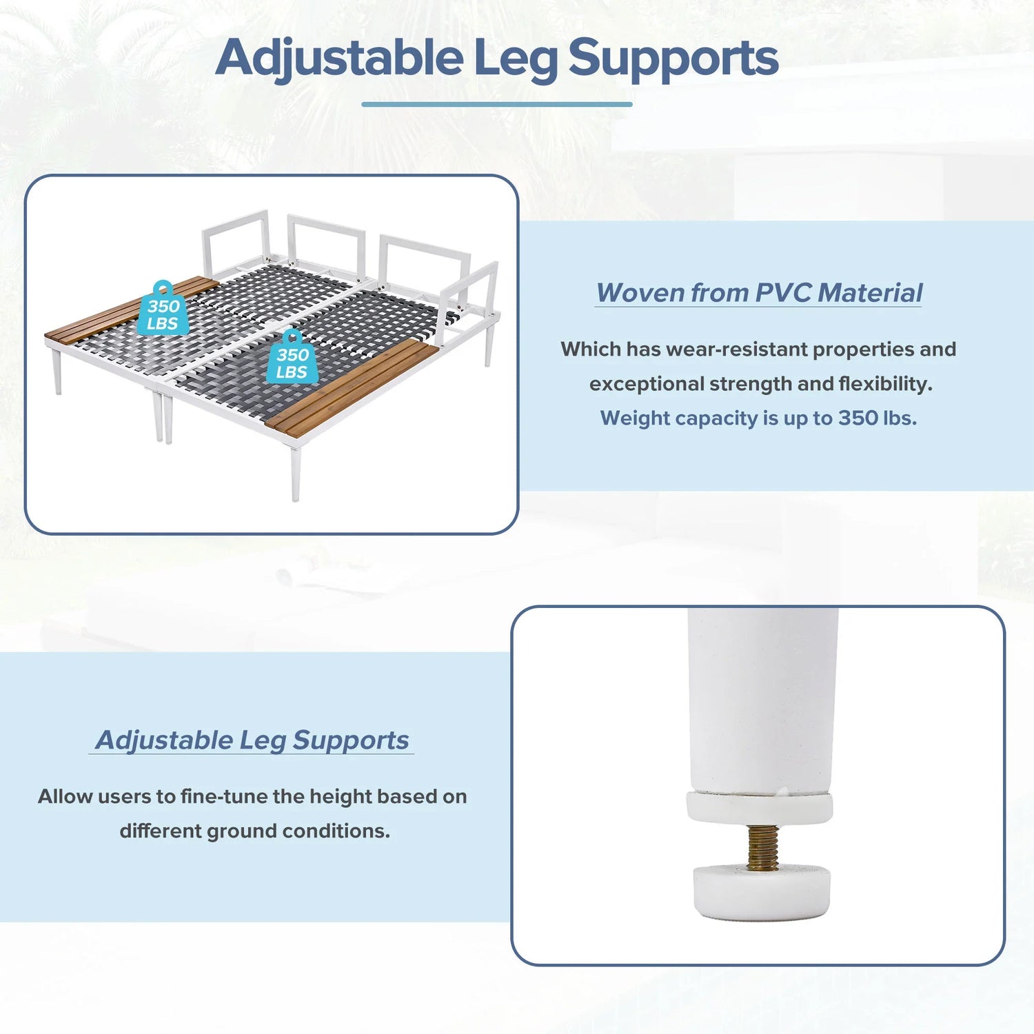 Summary Crafted from PVC material, this versatile daybed measures 59x55x21 inches and can comfortably accommodate two people or be transformed into two separate 59x27.5x21 inches daybeds for individual use. Its thoughtful design balances convenience and adaptability, allowing for varied configurations. The extra spaces design enhances functionality with solid wood strategically placed on each side, providing a dedicated space for essentials. Experience comfort with thick, fixable, and washable cushions. With side open pockets, 4 thick pillows can be slid over the armrests to help secure the pillows. 2 extra back pillows offer extra comfort. The sturdy iron legs provide reinforcement and support up to 350 lbs, ensuring stability and adaptability.