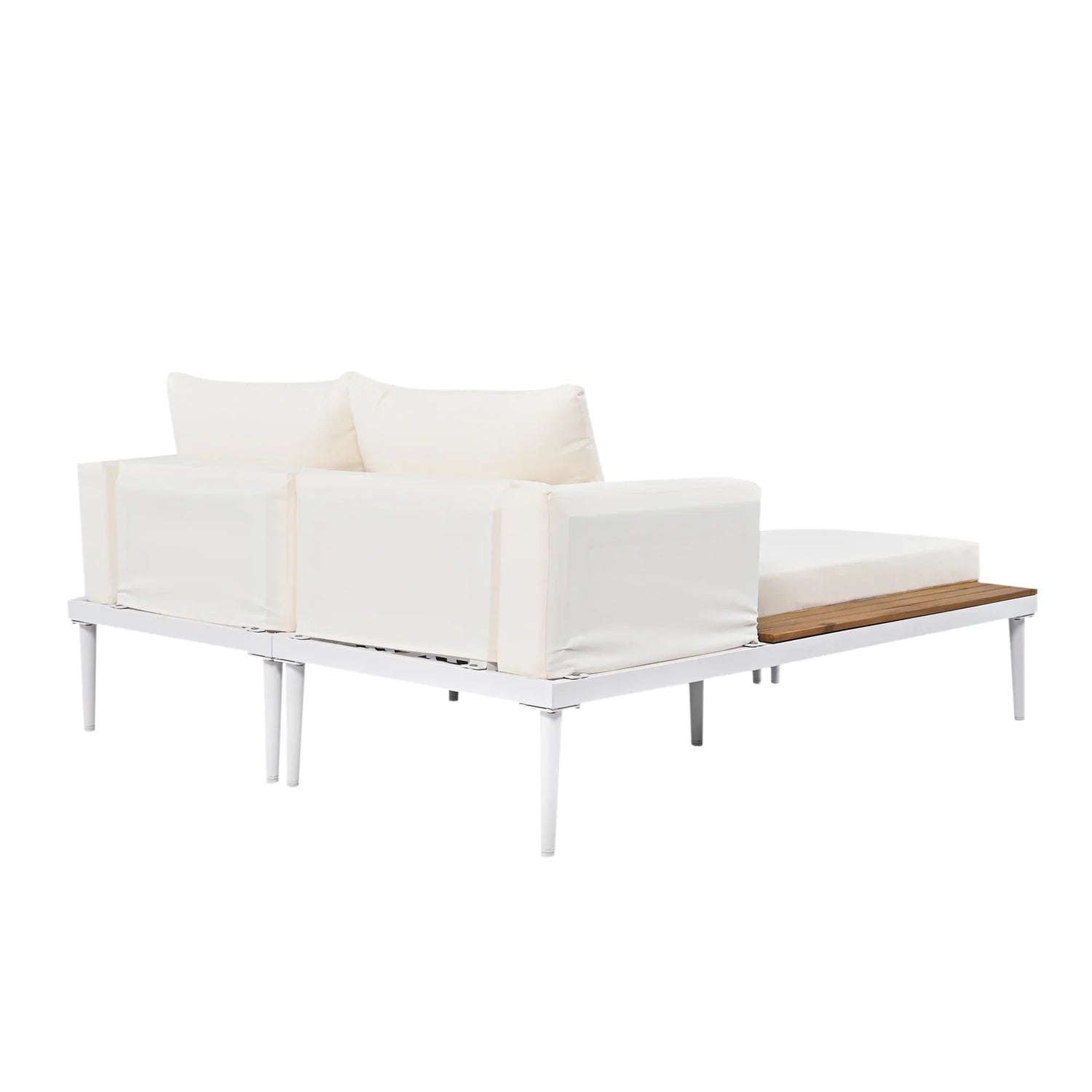This modern outdoor chaise lounge is for anyone who wants a low-slung daybed-style seating solution for patios, pool decks, or garden lounges. Designed for relaxed two-person lounging, it pairs wide, cushioned seating with a built-in wooden side tray so you can keep a drink, book or small planter within easy reach. The clean lines and boxy armrests give a contemporary, minimalist look that complements modern outdoor furniture collections.