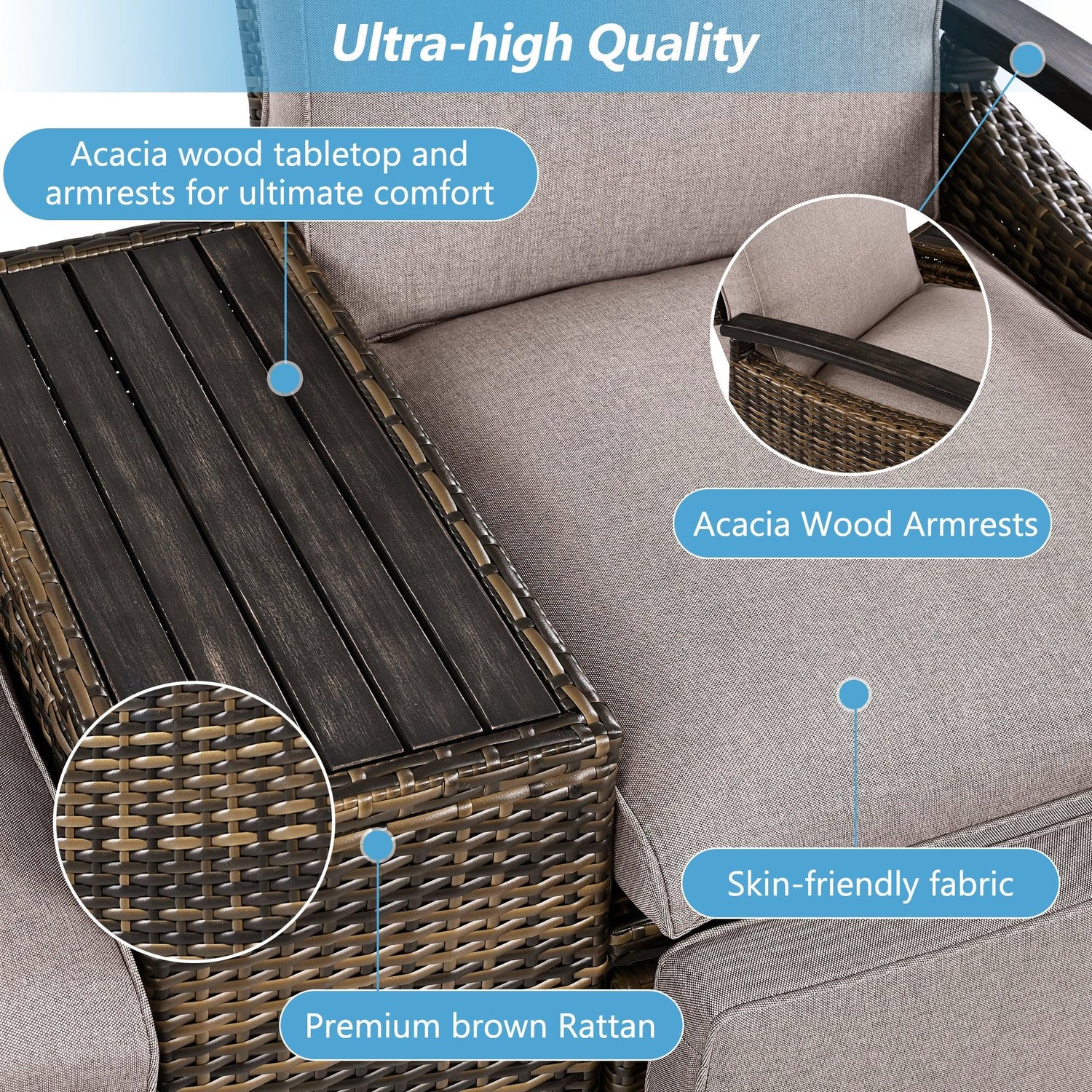 Crafted with woven wicker panels and acacia wood armrests, the set is finished in warm brown tones with grayish‑brown polyester cushions shown in the photos. Cushions are foam‑filled for supportive comfort and secure in place with straps/fasteners for a slip‑free seat. The design is intended for outdoor use—weather‑resistant framing and materials help the set stand up to everyday patio conditions while maintaining a relaxed, contemporary look.