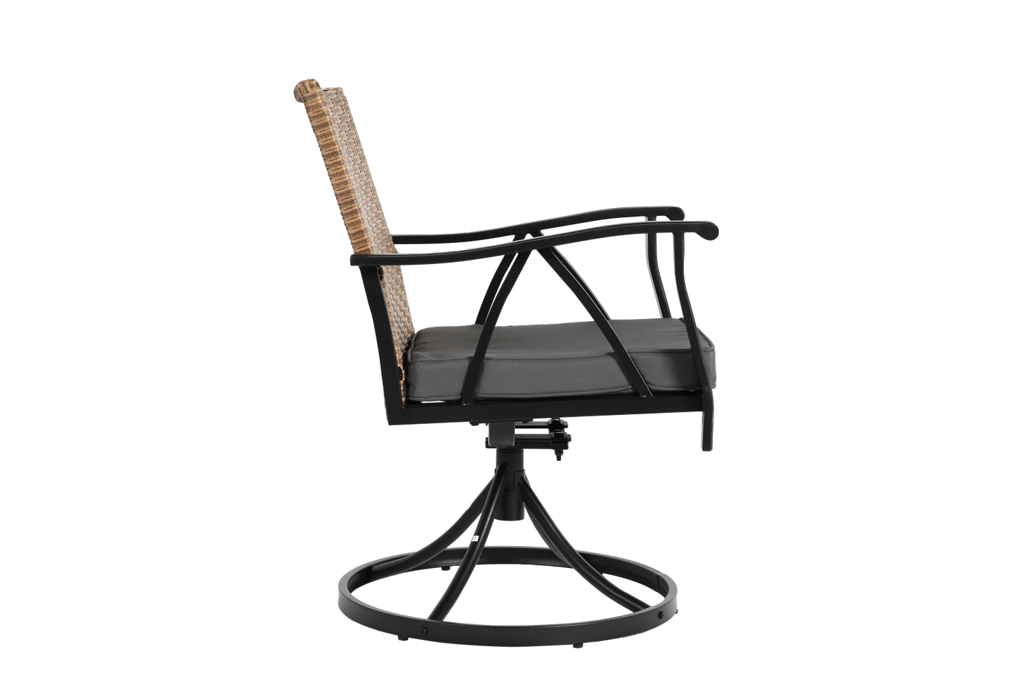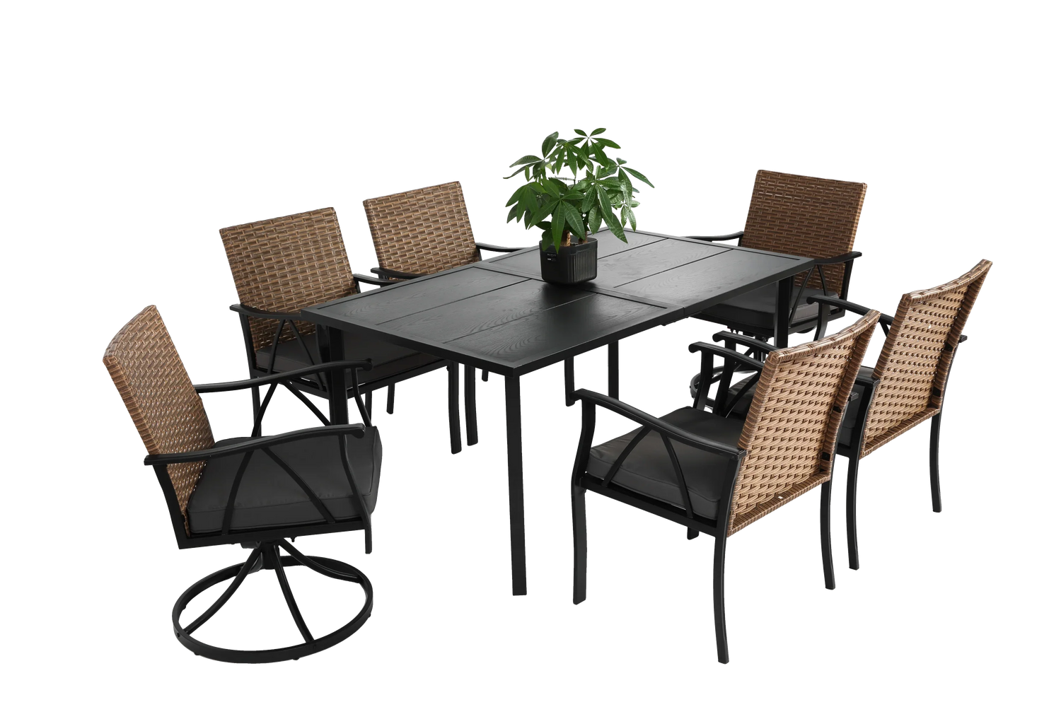 Some common features referenced here (steel frame, woven seating, swivel chairs) reflect typical specifications for similar 7-piece outdoor dining sets; they are cited from contemporary retailer listings and product examples. For exact dimensions, weight capacity, and warranty details, consult the specific product sheet or retailer listing linked to this item prior to purchase.