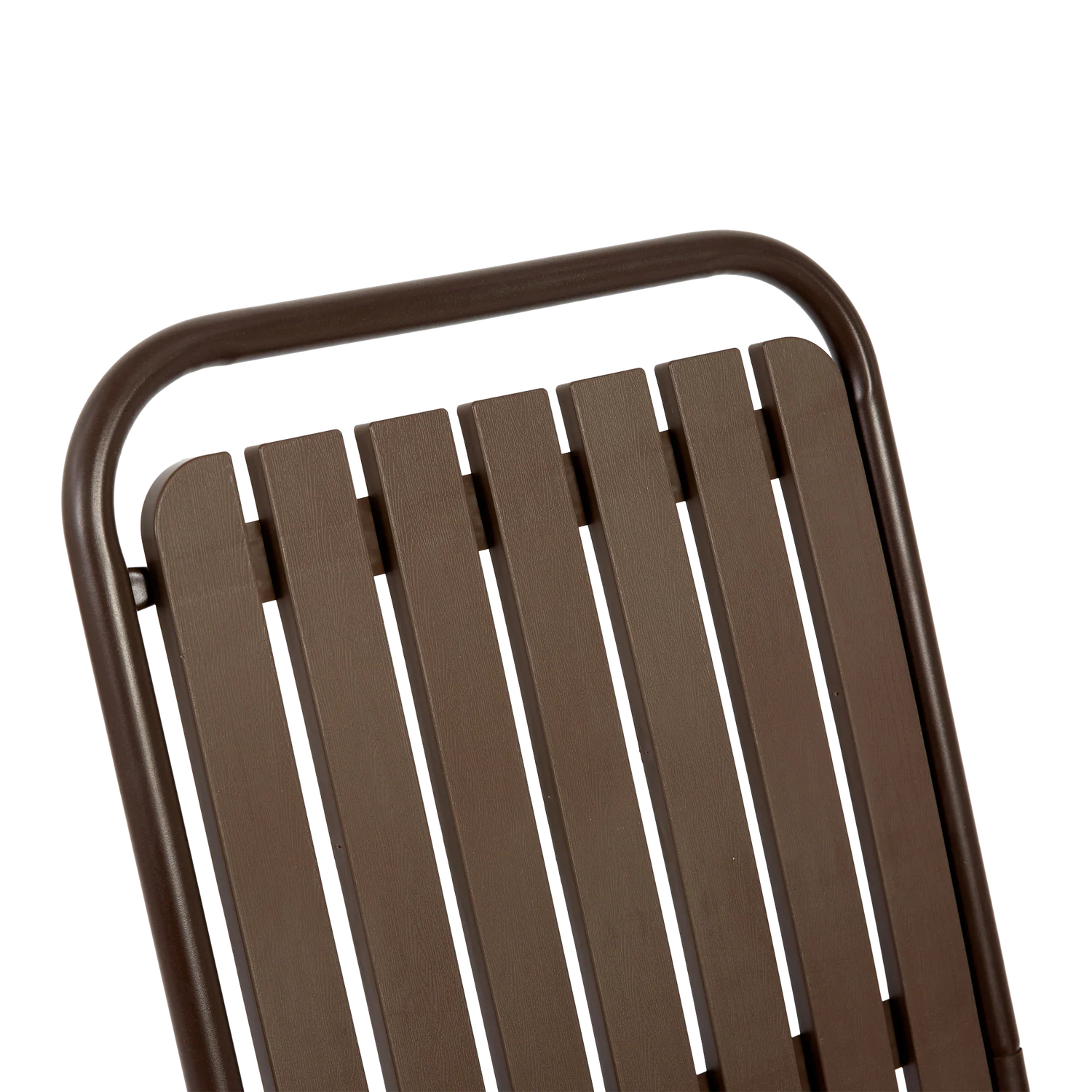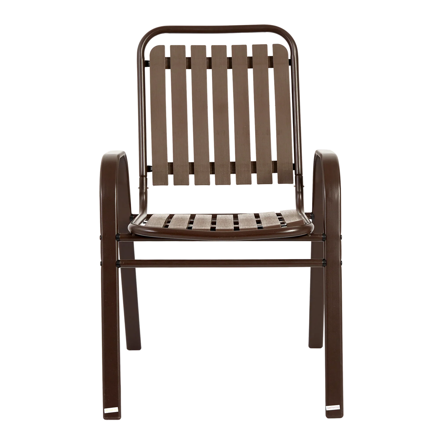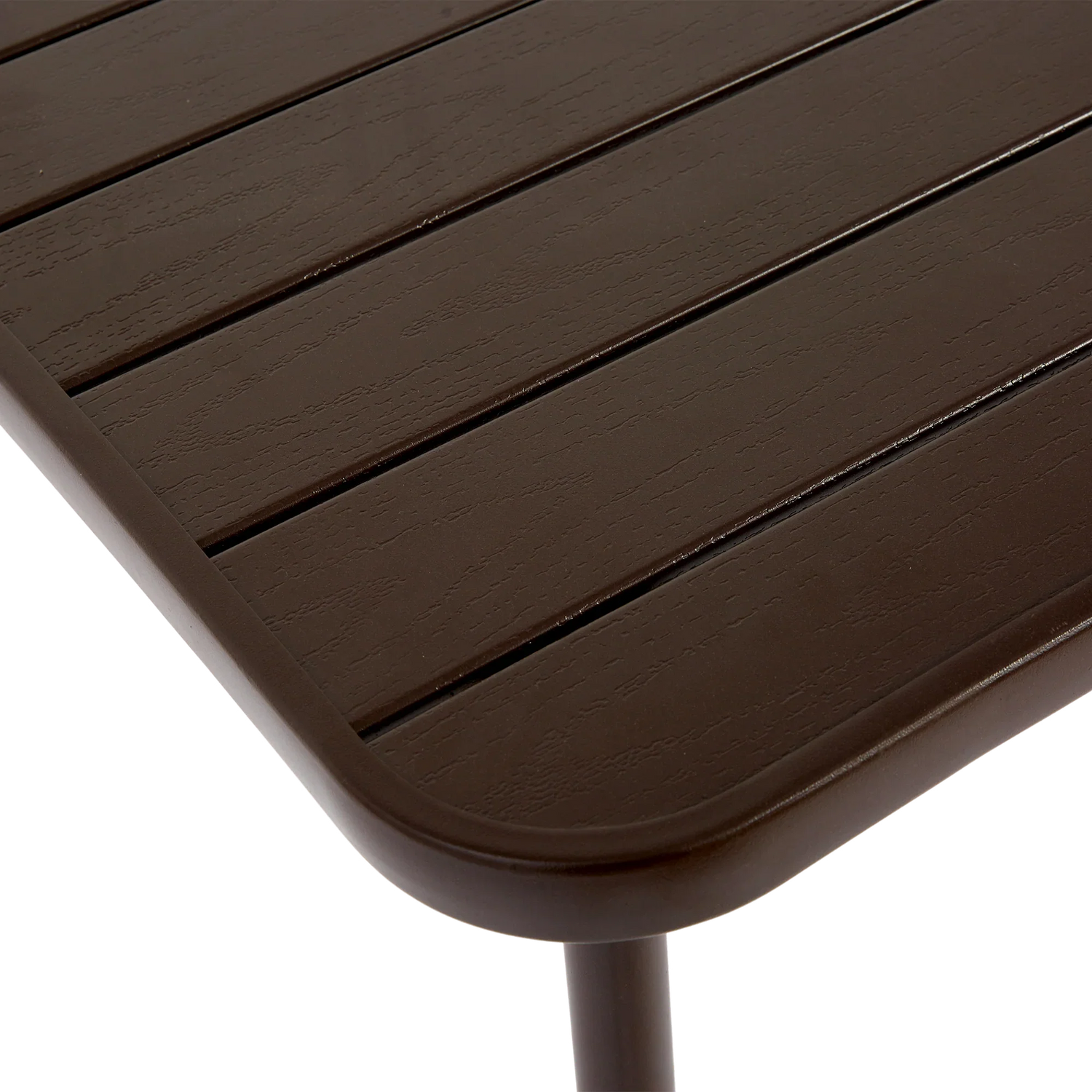 Complement the warm brown steel with soft outdoor cushions in neutral or earthy tones for extra comfort (cushions sold separately). Pair with a low‑profile umbrella for daytime shade, or add potted greenery and subtle string lights to create a cozy evening dining area.