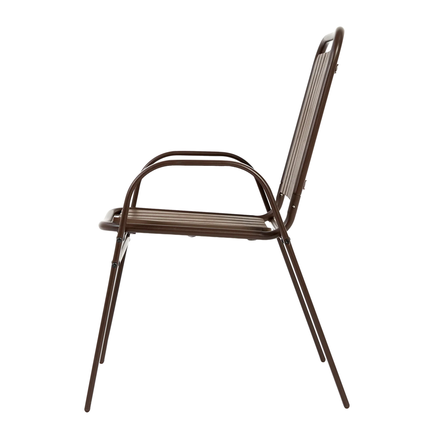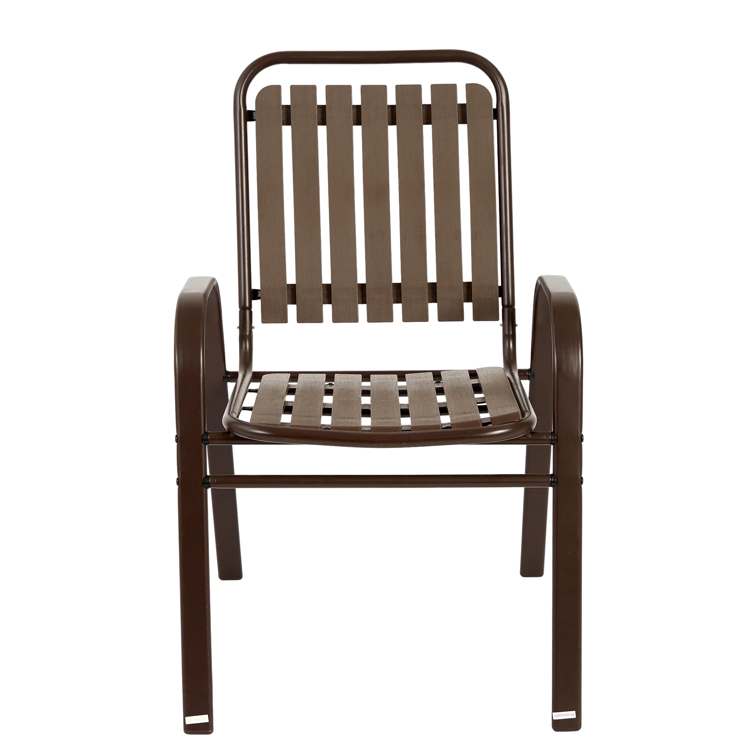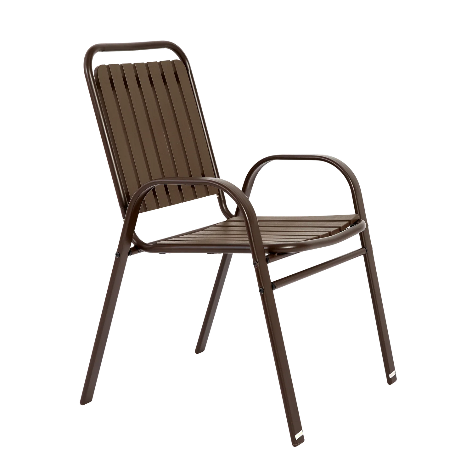 Complement the warm brown steel with soft outdoor cushions in neutral or earthy tones for extra comfort (cushions sold separately). Pair with a low‑profile umbrella for daytime shade, or add potted greenery and subtle string lights to create a cozy evening dining area.