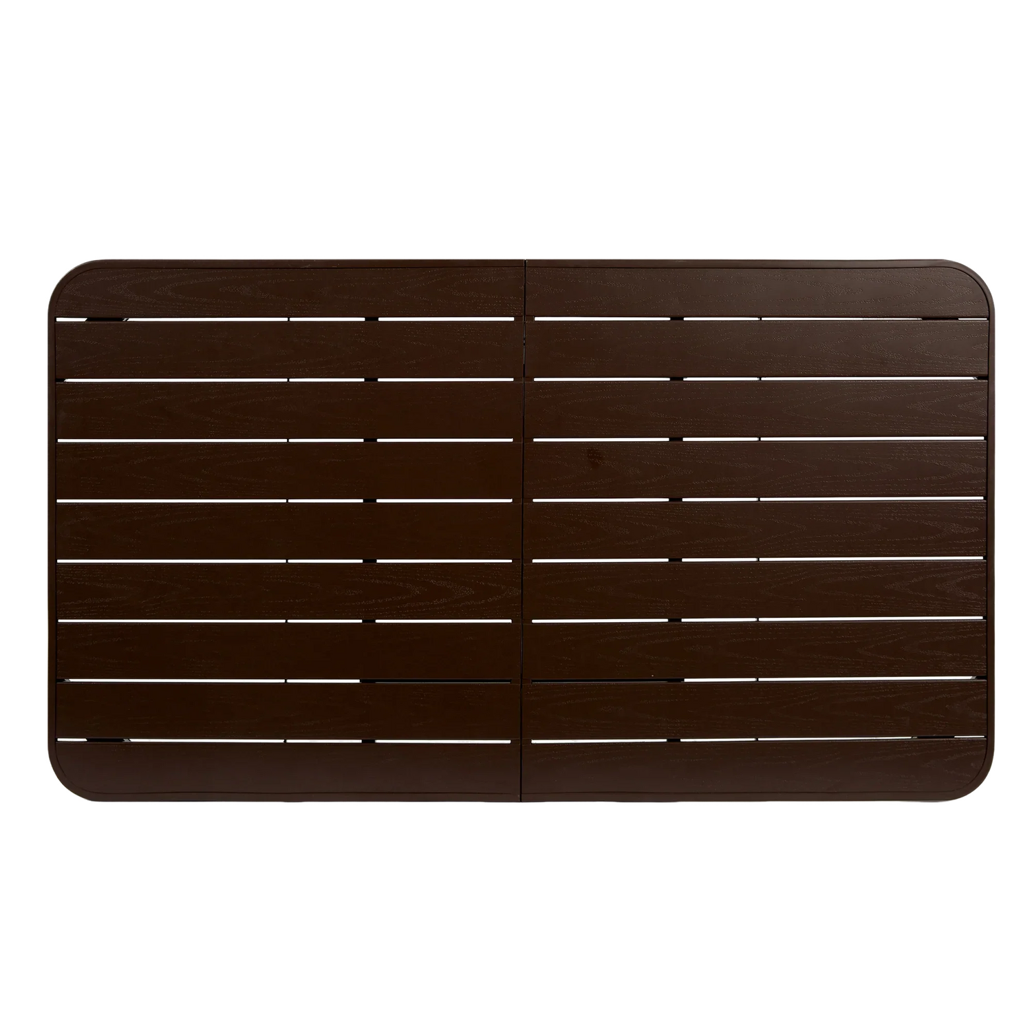 - Simple, modern styling: Slatted surfaces and a warm brown finish create a timeless, versatile look that pairs well with modern or transitional outdoor decor.