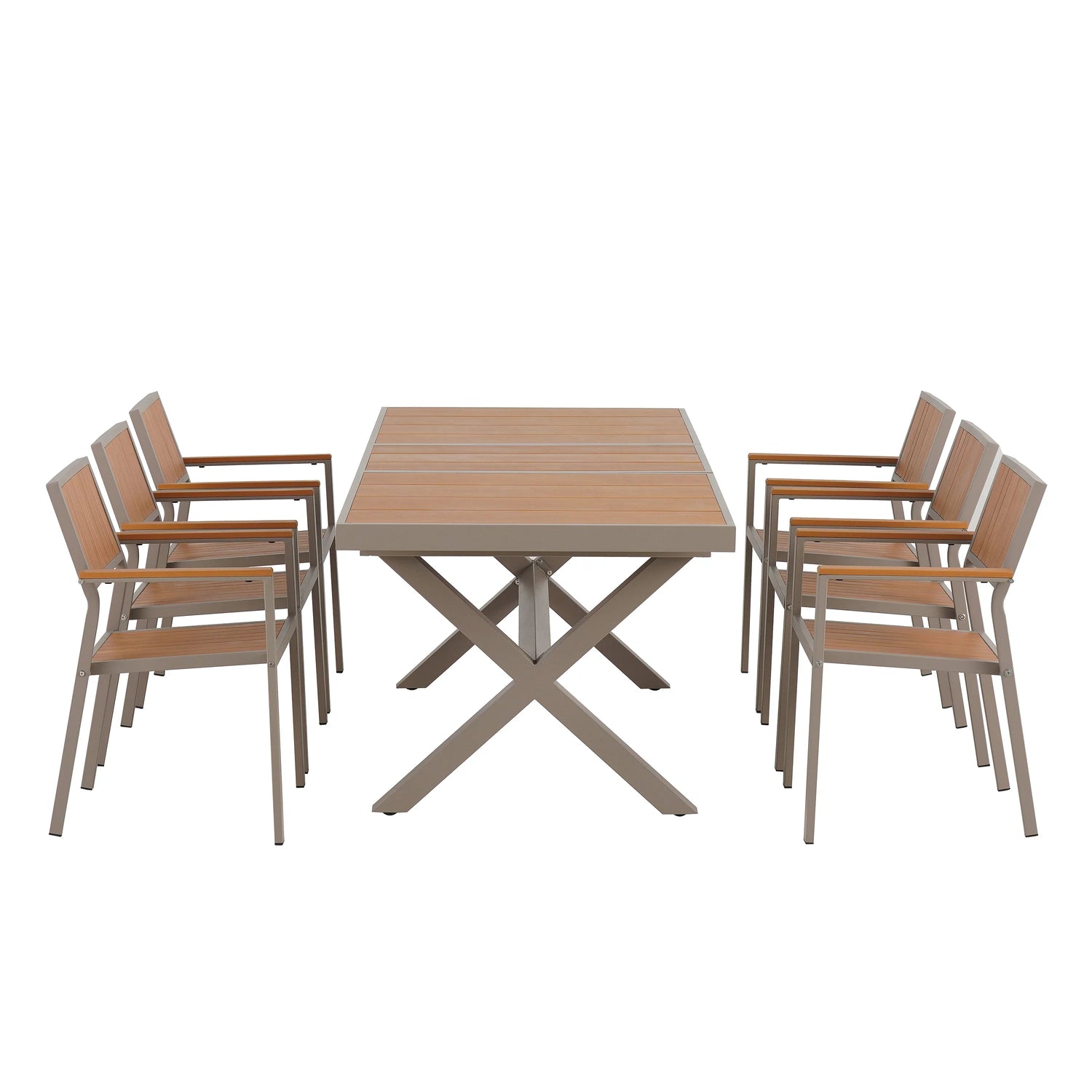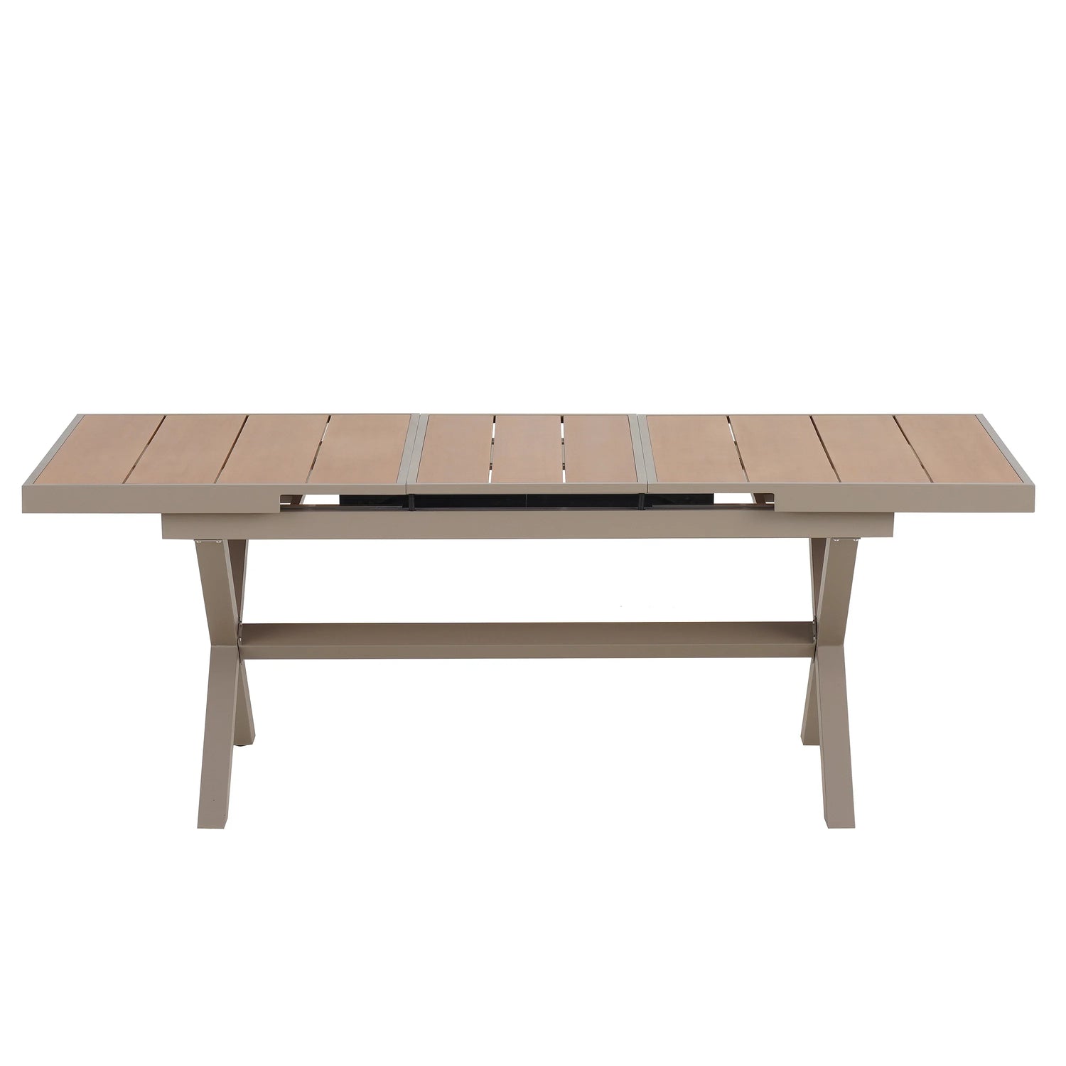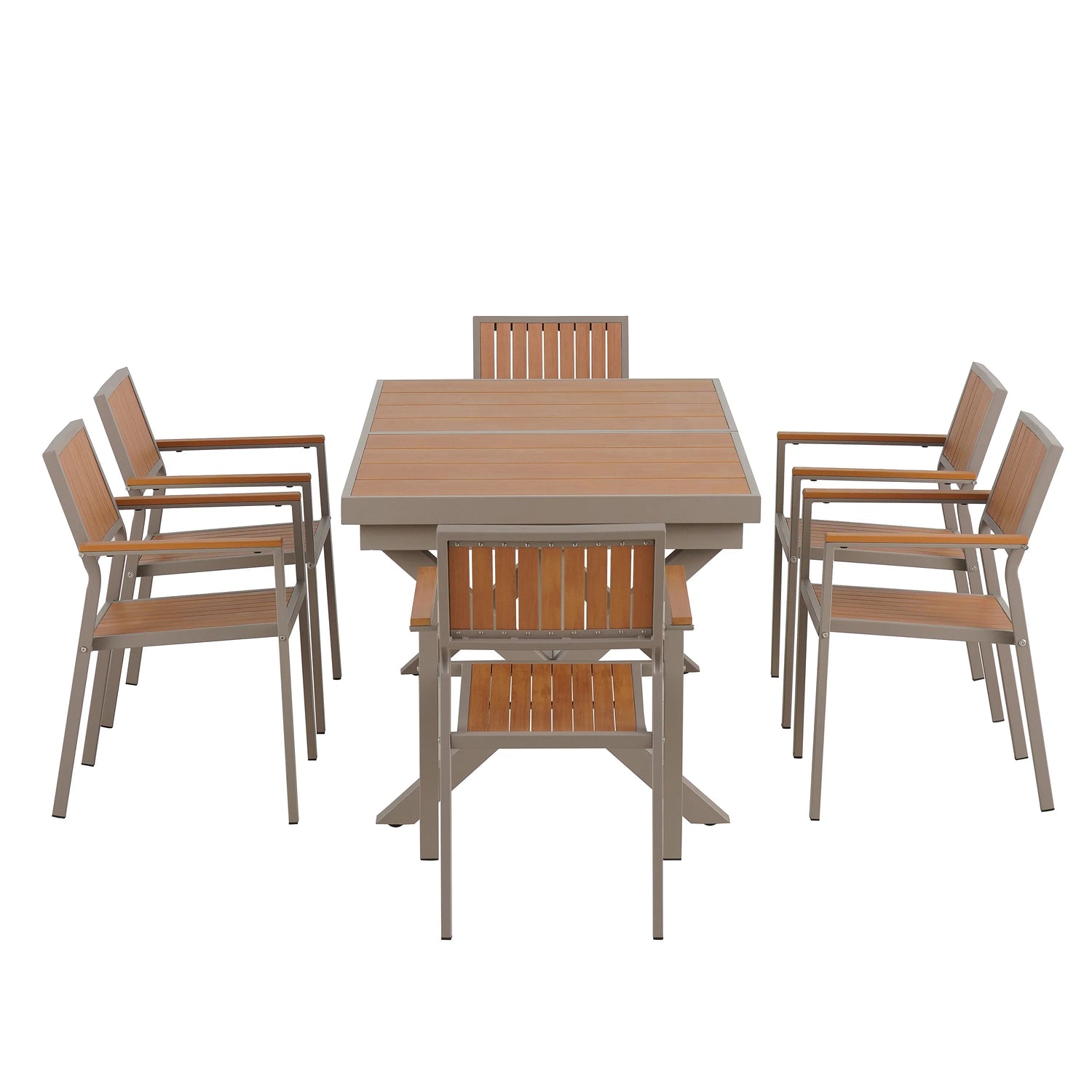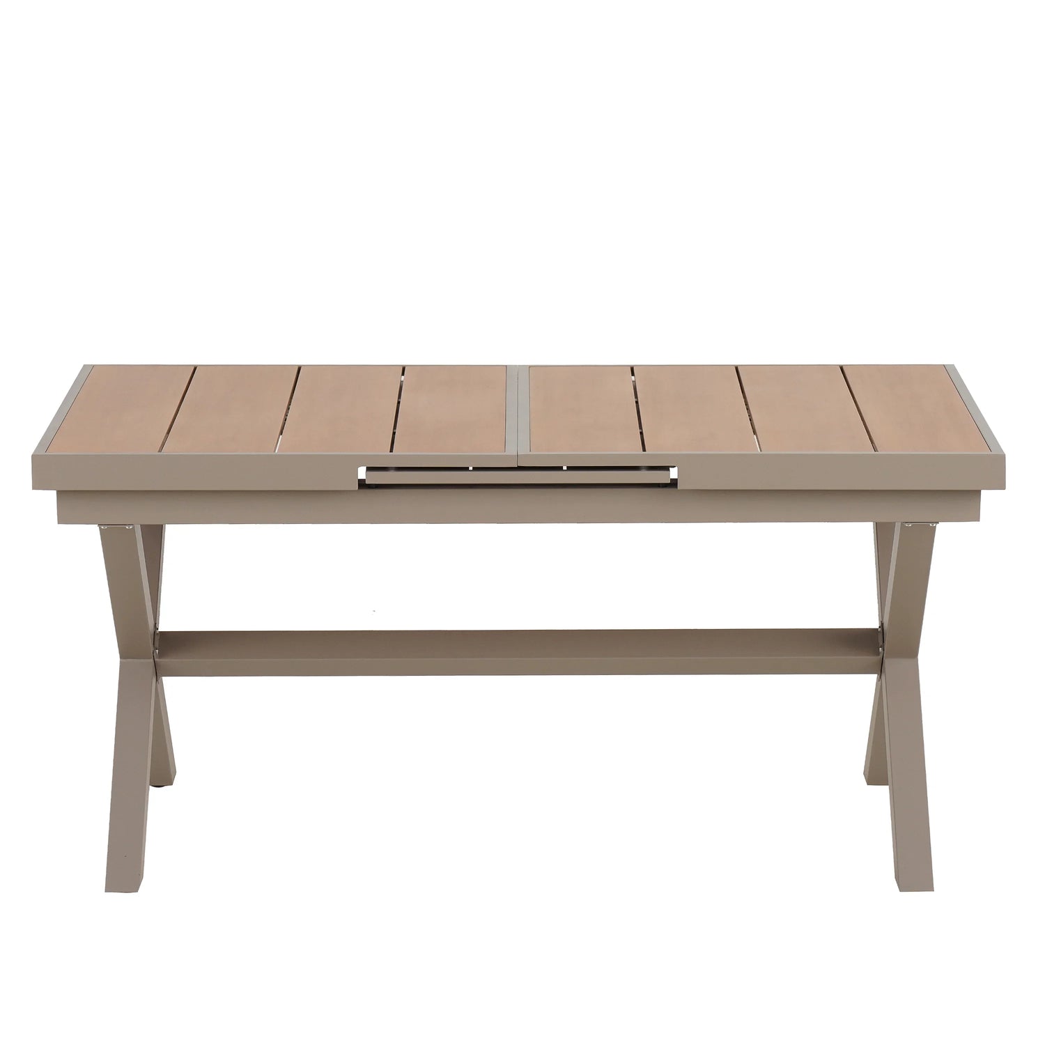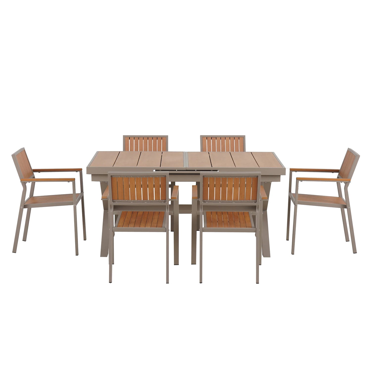 Every piece combines a powder-coated iron frame with wood‑look plastic slats in warm camel and natural tones, giving the set the look of timber with the low-maintenance performance of engineered materials. The extendable tabletop makes it easy to expand from an everyday dining footprint to room for extra guests — a practical choice for weekend brunches, summer dinners, or poolside meals.