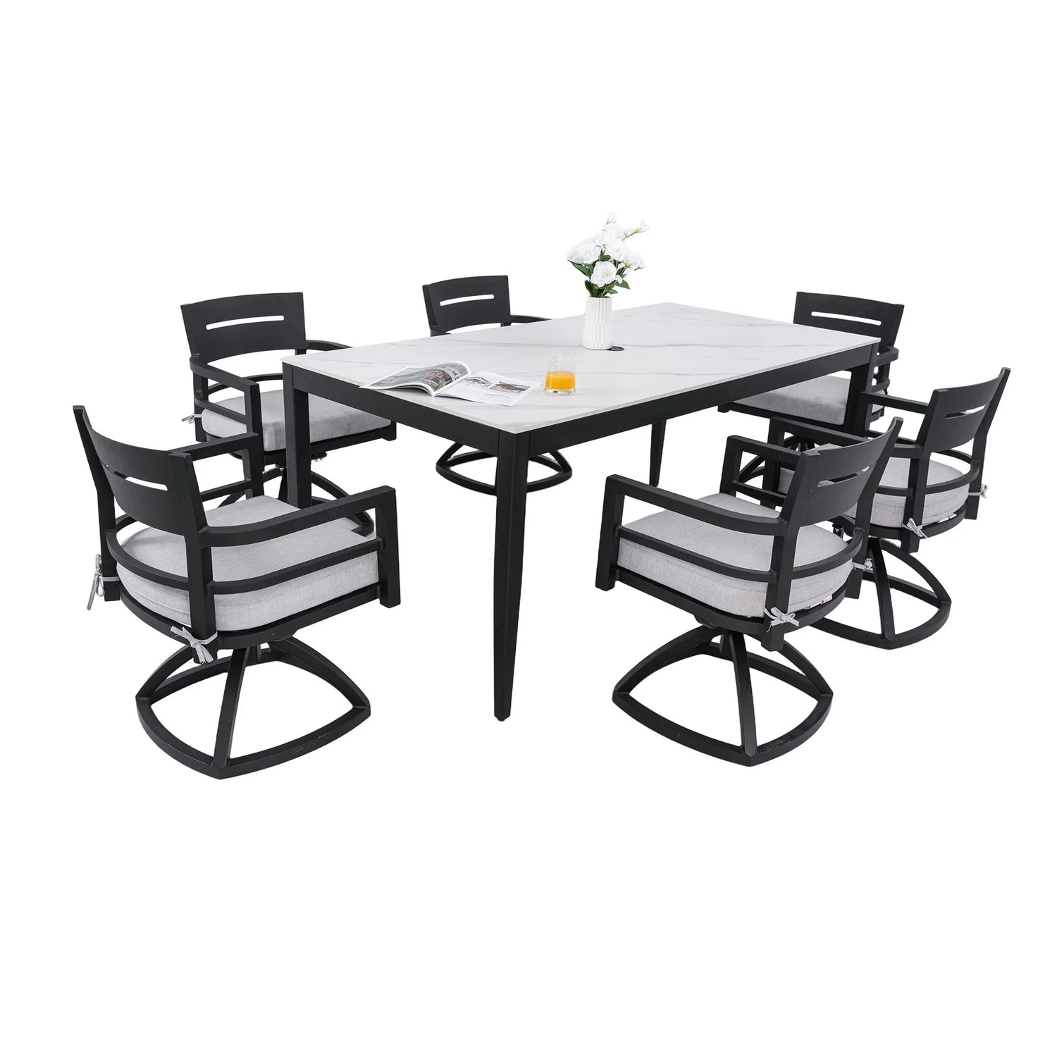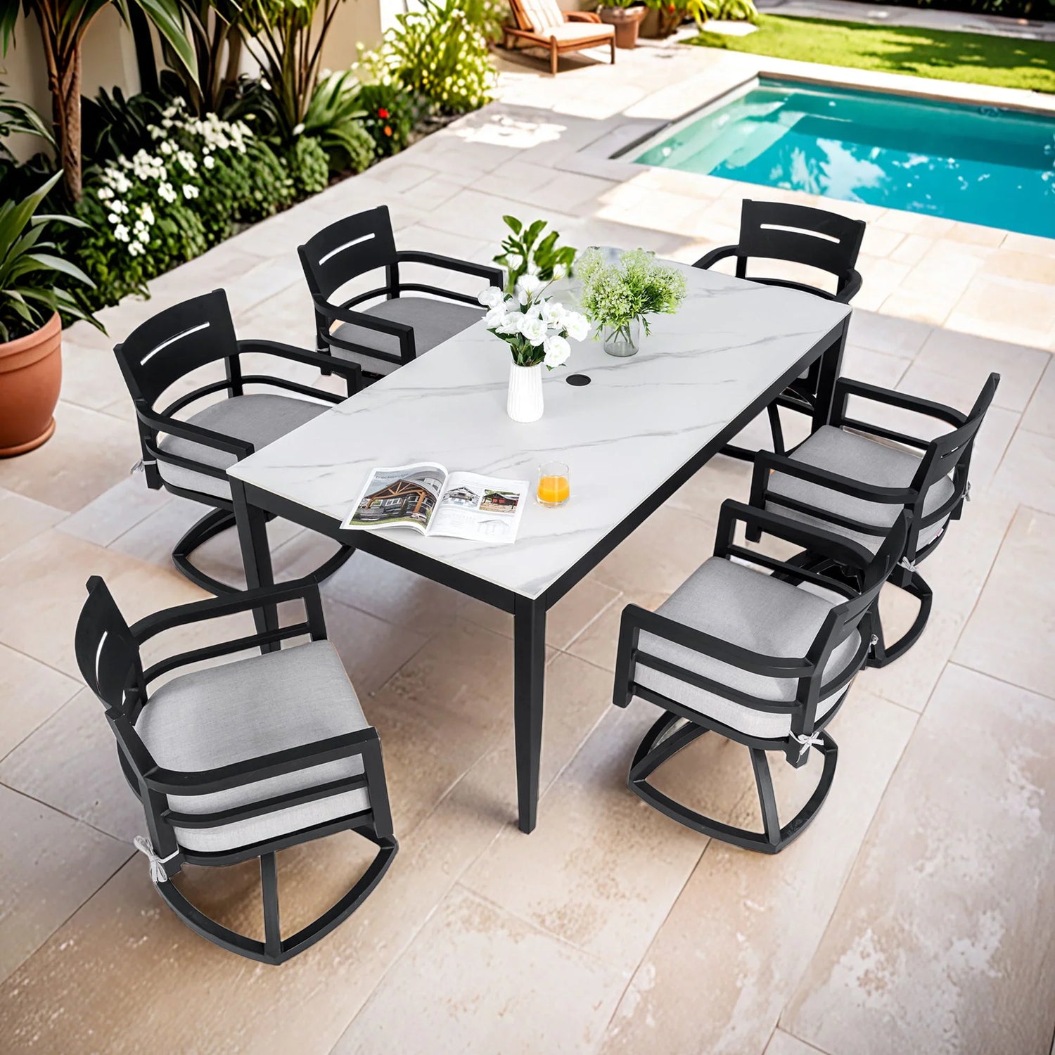 - Dining Set:Includes a rectangular table with a marble-inspired sintered stone top and 6 swivel rockers.