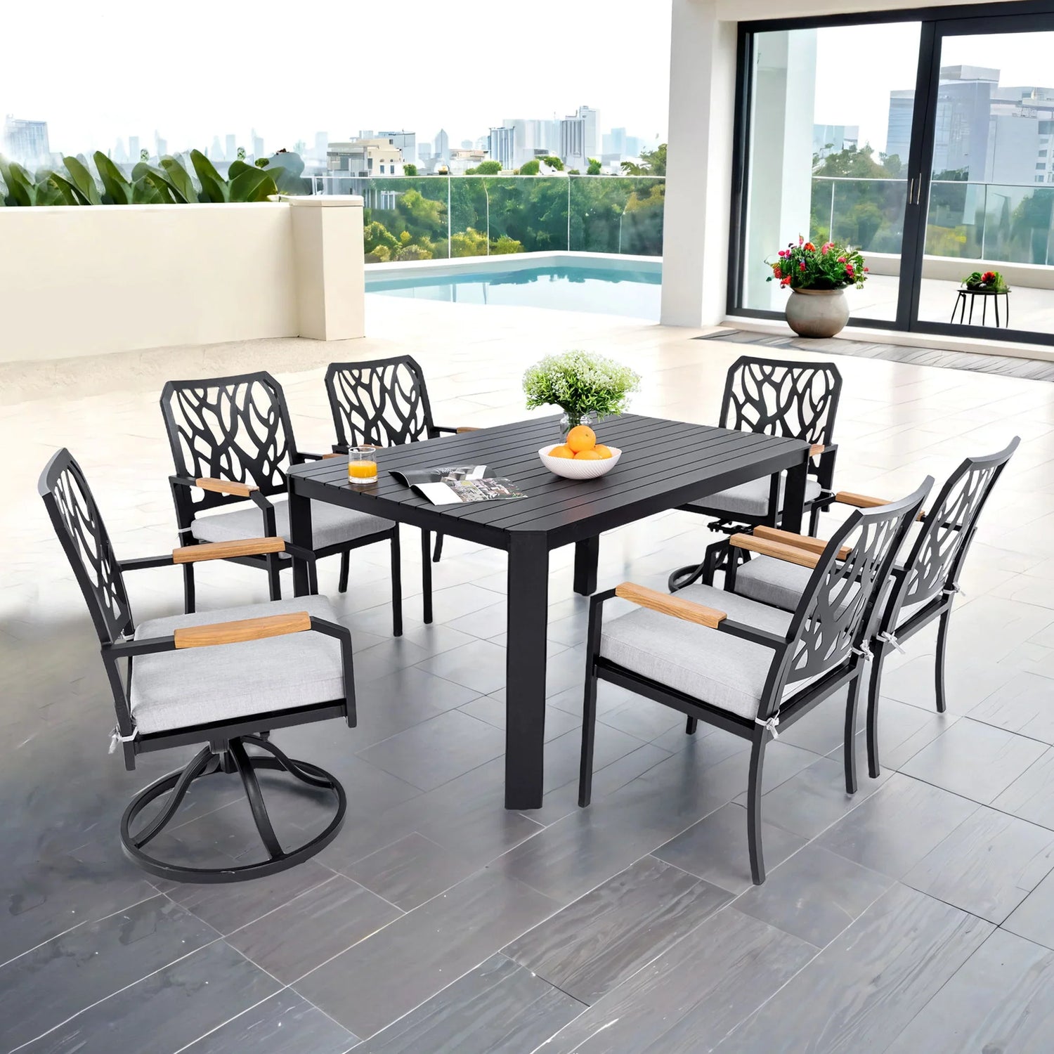 - Innovative Tabletop Design: Features a frameless rectangular tabletop with alternating wide and narrow aluminum slats, providing safety, efficient drainage, and a sleek, modern aesthetic.