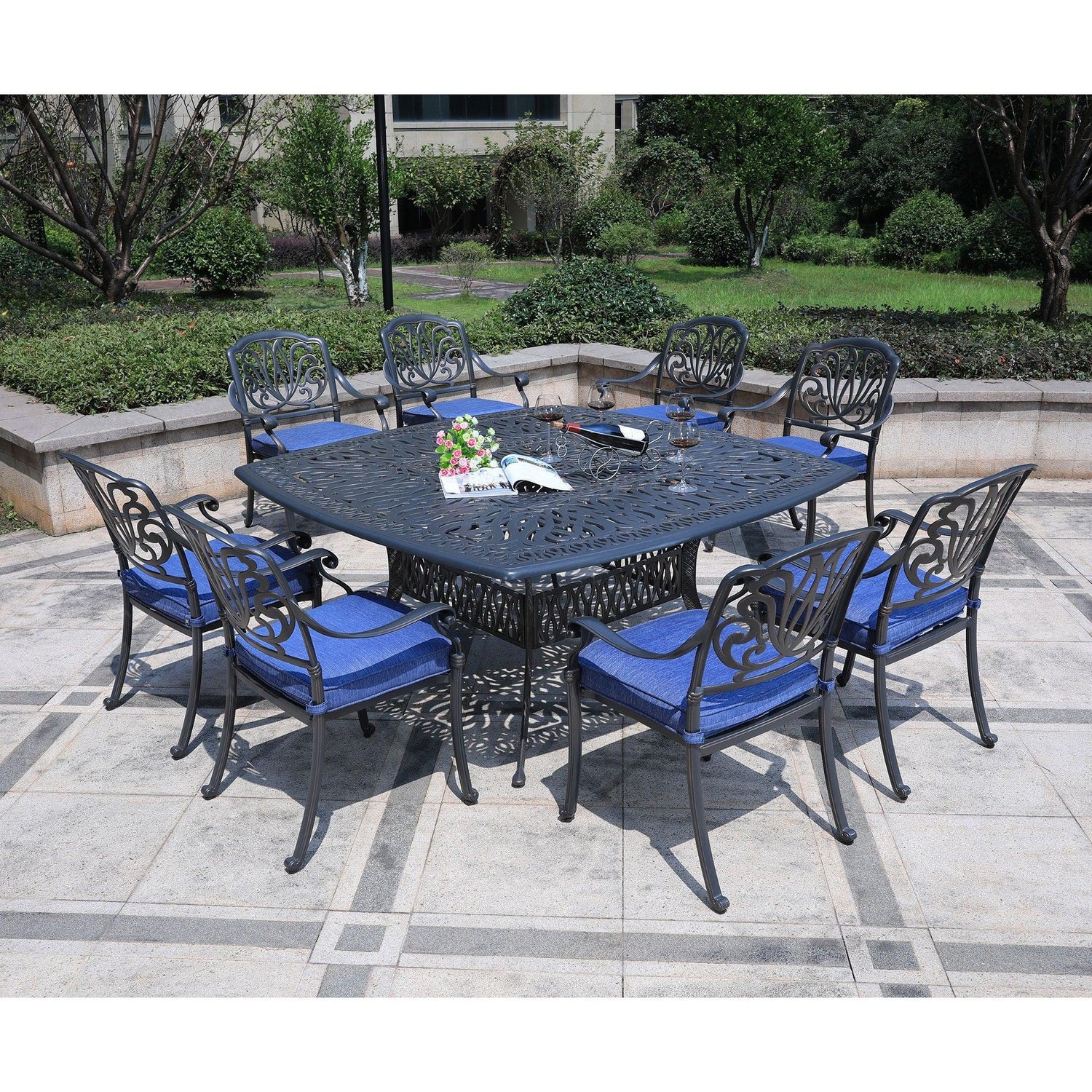Square 8 Person 64" Long Aluminum Dining Set With Cushions - Gray / Navy