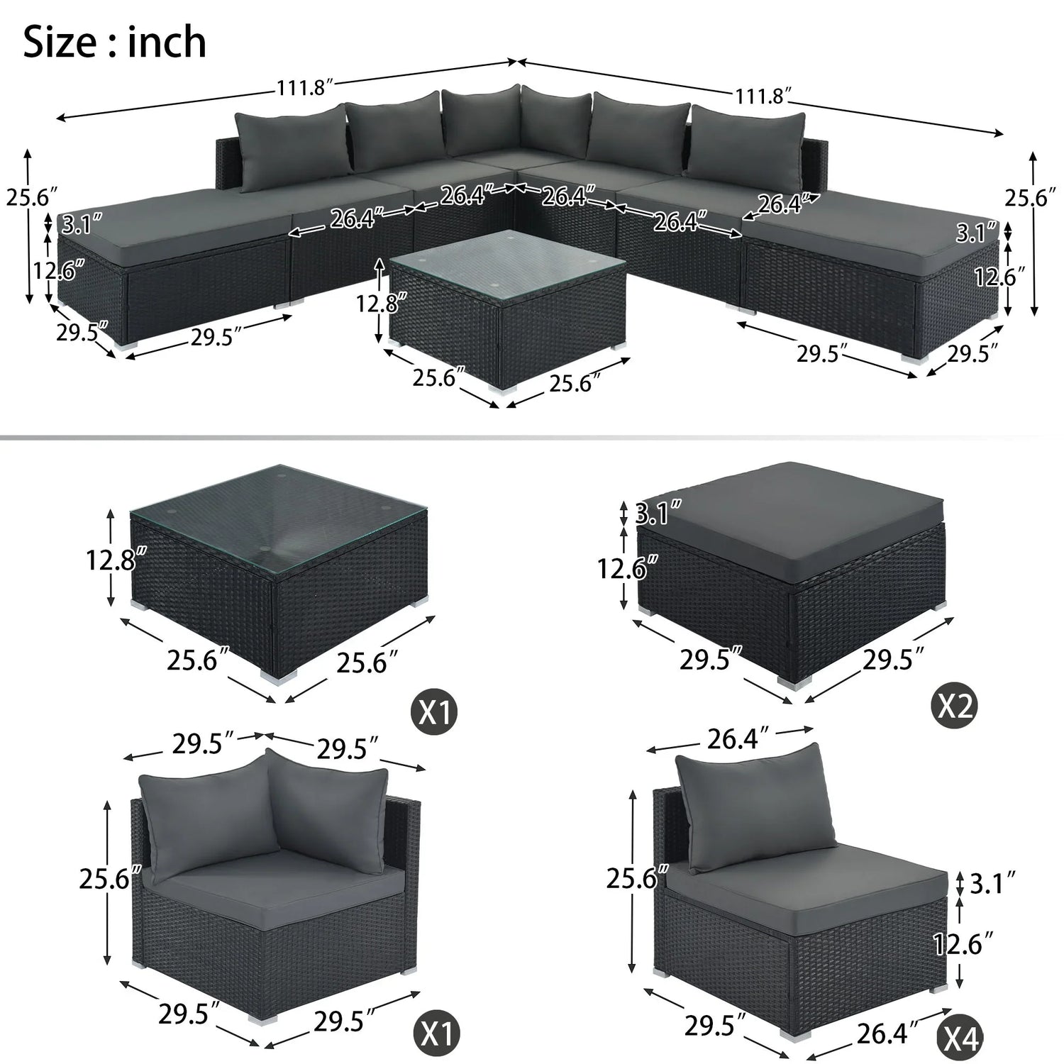 - Ideal for Outdoor Use: With luxurious gray cushions and black wicker, this set is perfect for gardens, backyards, and poolside areas. Designed to seat 5-8 people, it provides a comfortable and stylish solution for outdoor gatherings and relaxation.