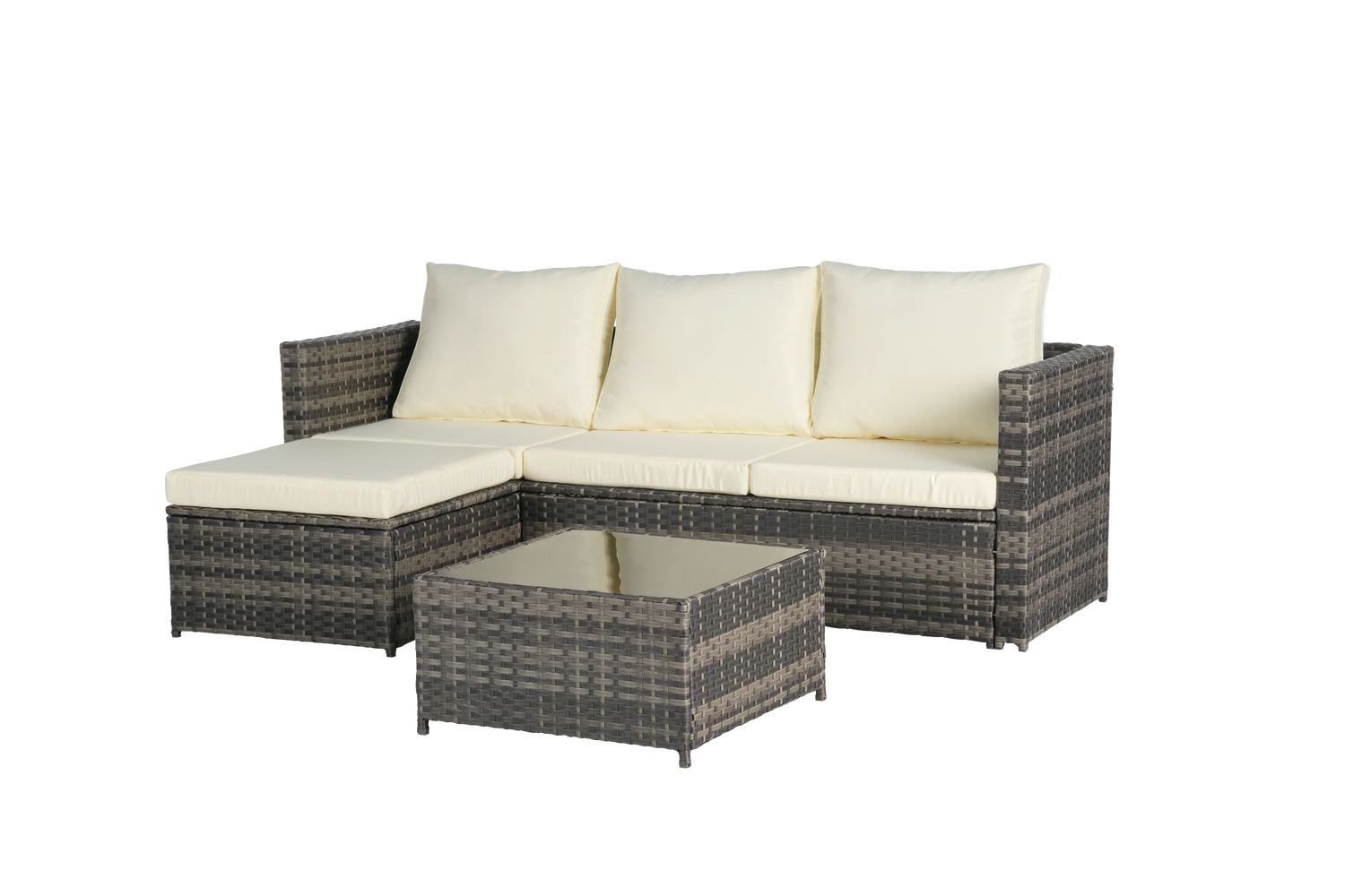 COLOR:Gray Rattan +Beige Cushion PRODUCT SIZE : 1* Three seat sofa : 75.59*24.8*25.2 inch 1*single seat sofa :29.13*24.8*25.2 inch 1*Ottoman : 25.2*24.8*25.2 inch 1*Coffee table: 23.62*23.62*12.6 inch Net weight :110.23 lbs Gross weight : 119.05 lbs Single sofa Load bearing:380 LBS Cushion Thickness:3.2' Features of PE rattan Coffee table with tempered glass 100% hand-woven by professional worker to make it though and comfortable Weather resistant- can be put both indoor and outdoor;Chlorine resistant, salt resistant, suitable for swimming pool Good breathablity, good for our health Anti-UV- fadeless Eco-friendly,odorless Strong-durable Advantage: The advantage of outdoor garden furniture: 1.Material:High quality polyethylene rattan. 2.Frame:aluminum frame,power coated,no rust. 3.Fabric:Sunproof or sunbrella,up to your options. 4.Foam:Quick dry foam,clean and comfortable. 5.Handcrafted:100% handwoven wicker. 6. Low after-sale rate Notice: 1 Don't tighten each screw at the beginning, advised to leave each screw a little loose till all of the screws are in, and then tighten all of them. 2 Manual measurement has been used 3 Items may slightly differ from photo in terms of color due to the lighting or your monitors display. 4 Take precaution during inclement weather conditions