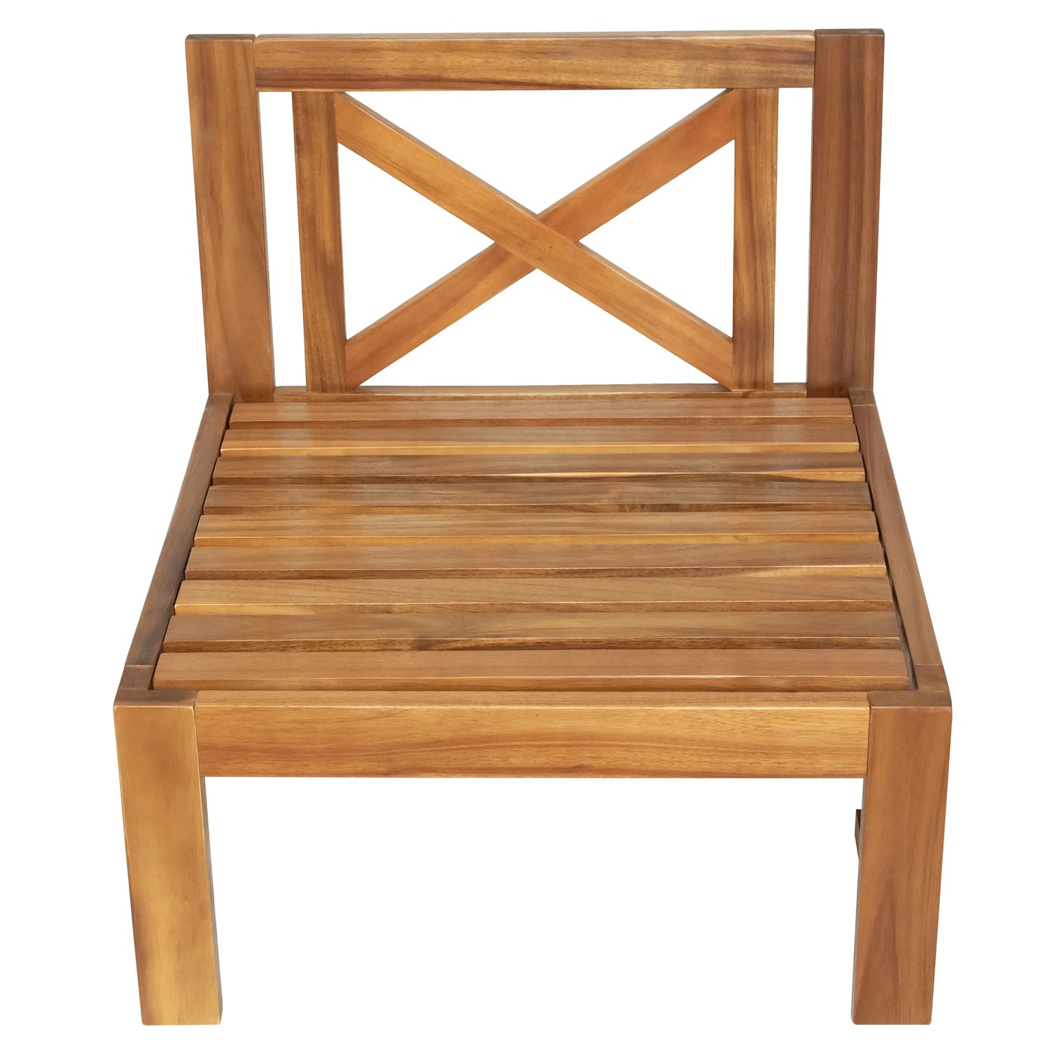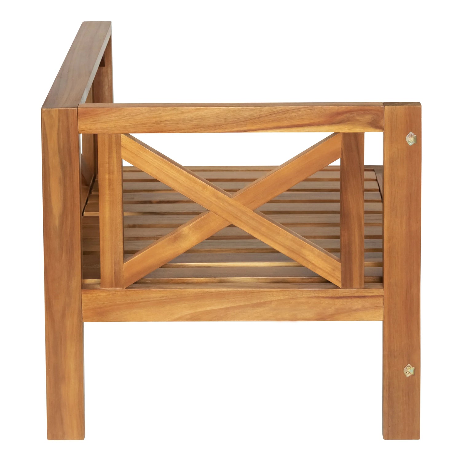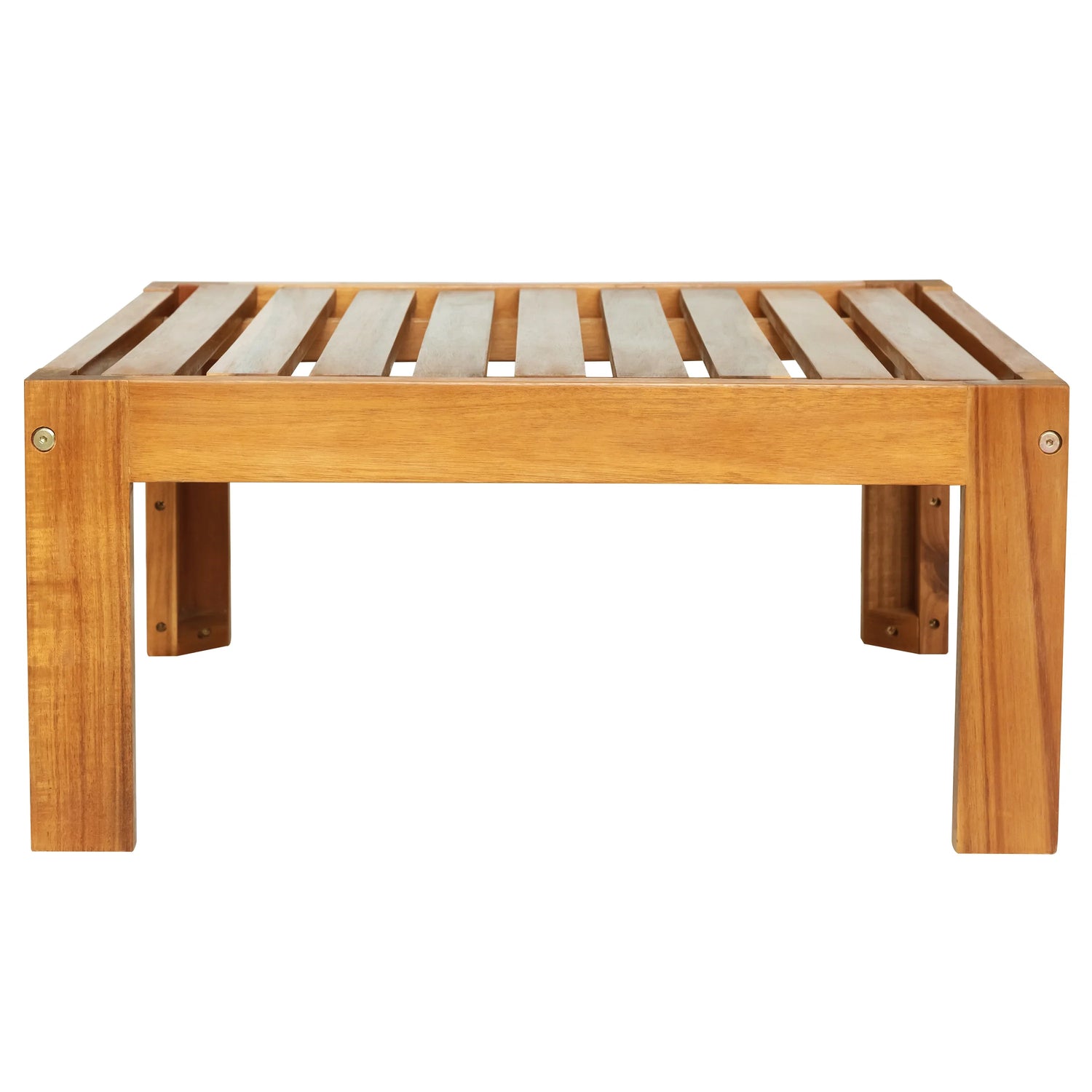 This outdoor patio seating group is crafted with acacia wood, which creates a naturally fine texture and a charming aesthetic. The set is designed for longevity with this material because the wood is durable, sturdy, and withstands climatic variations well.