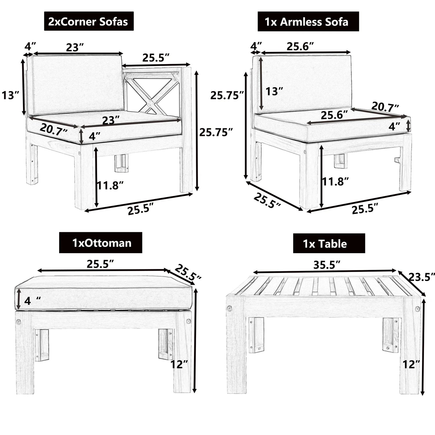 Overall Product Dimension | Corner Sofa:25.5x25.5x25.75inch(LXWXH); Armless Sofa: 25.5x25.5X25.75inch(LXWXH); Ottoman: 25.5x25.5x12inch(LXWXH,height with cushion); Tea Table: 35.5x 23.5x12inch(LXWXH) |