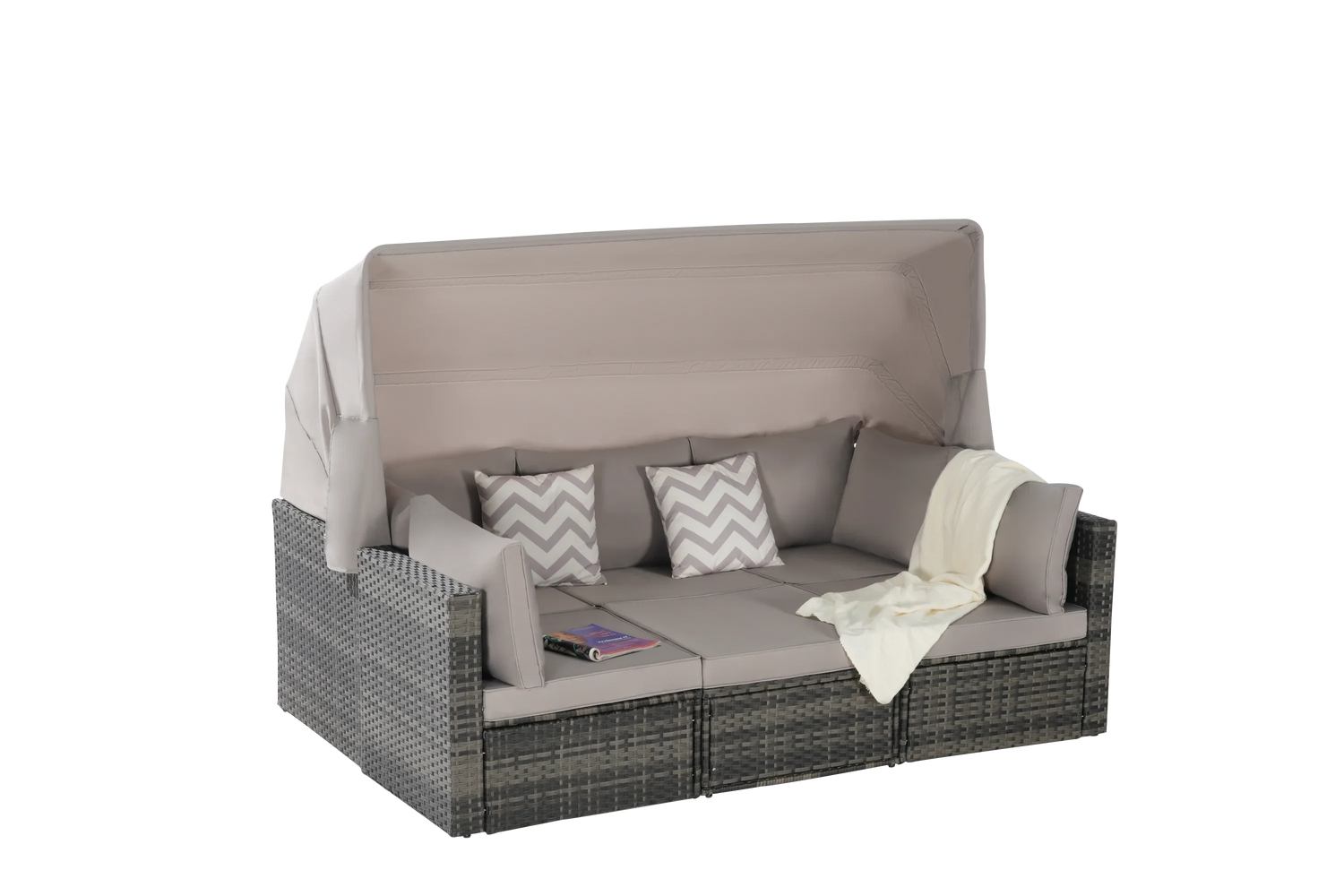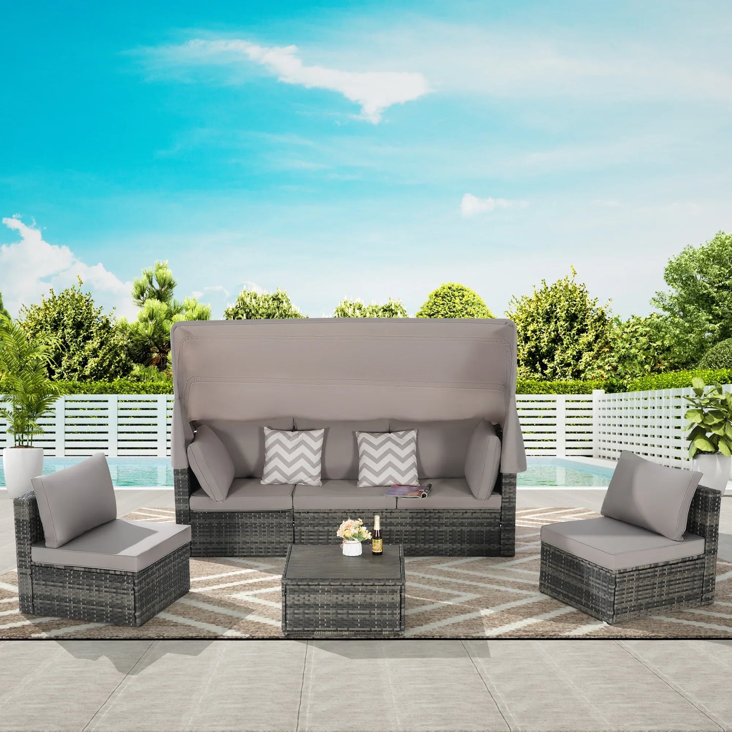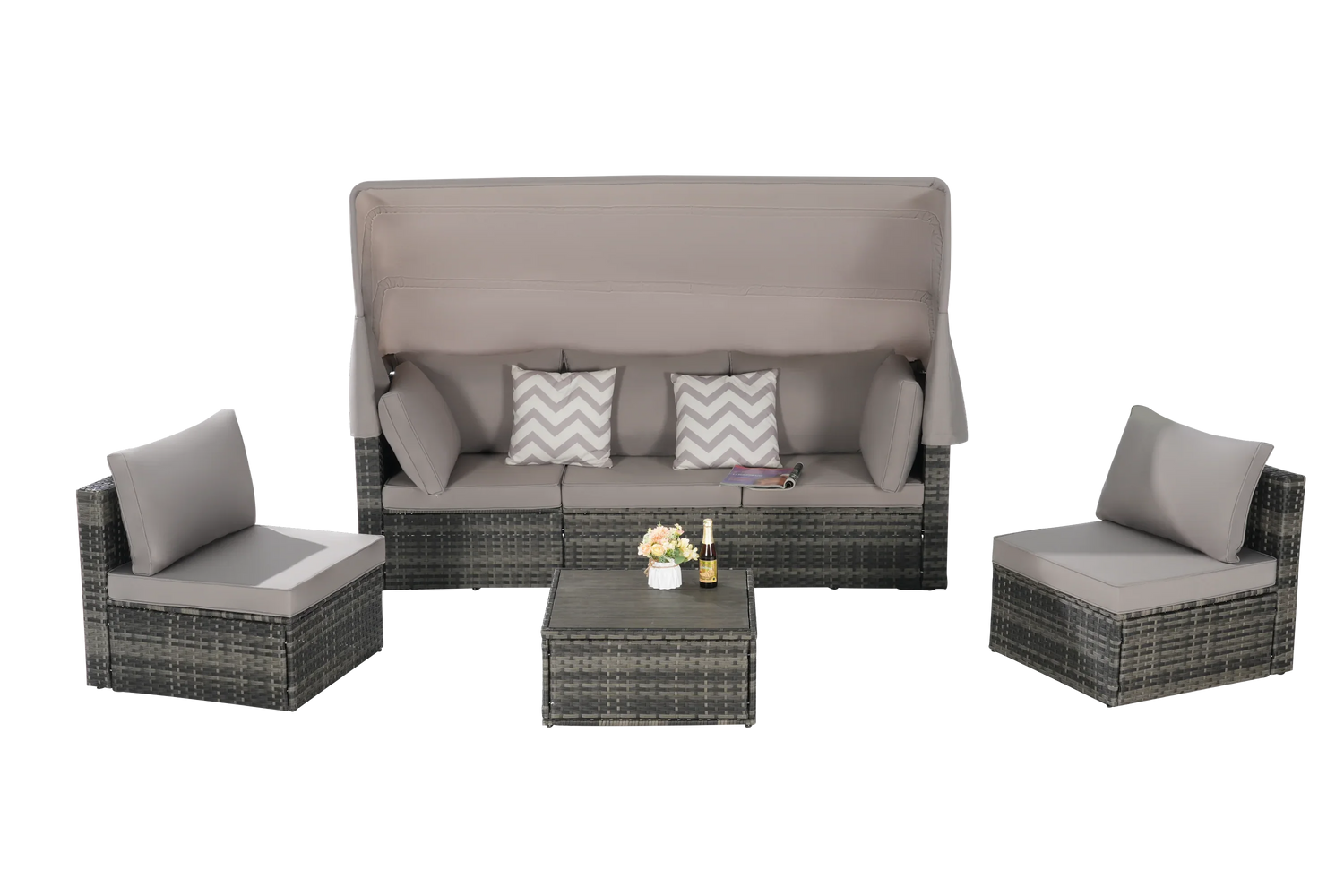5 Pieces Outdoor Patio Wicker Daybed Furniture Set with Retractable Canopy, Storable Side Table