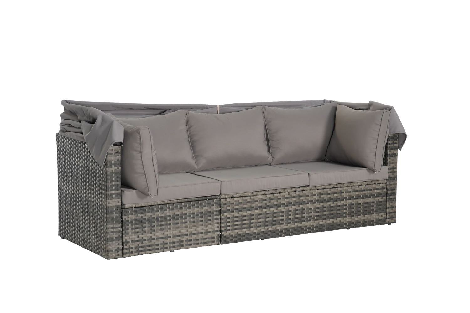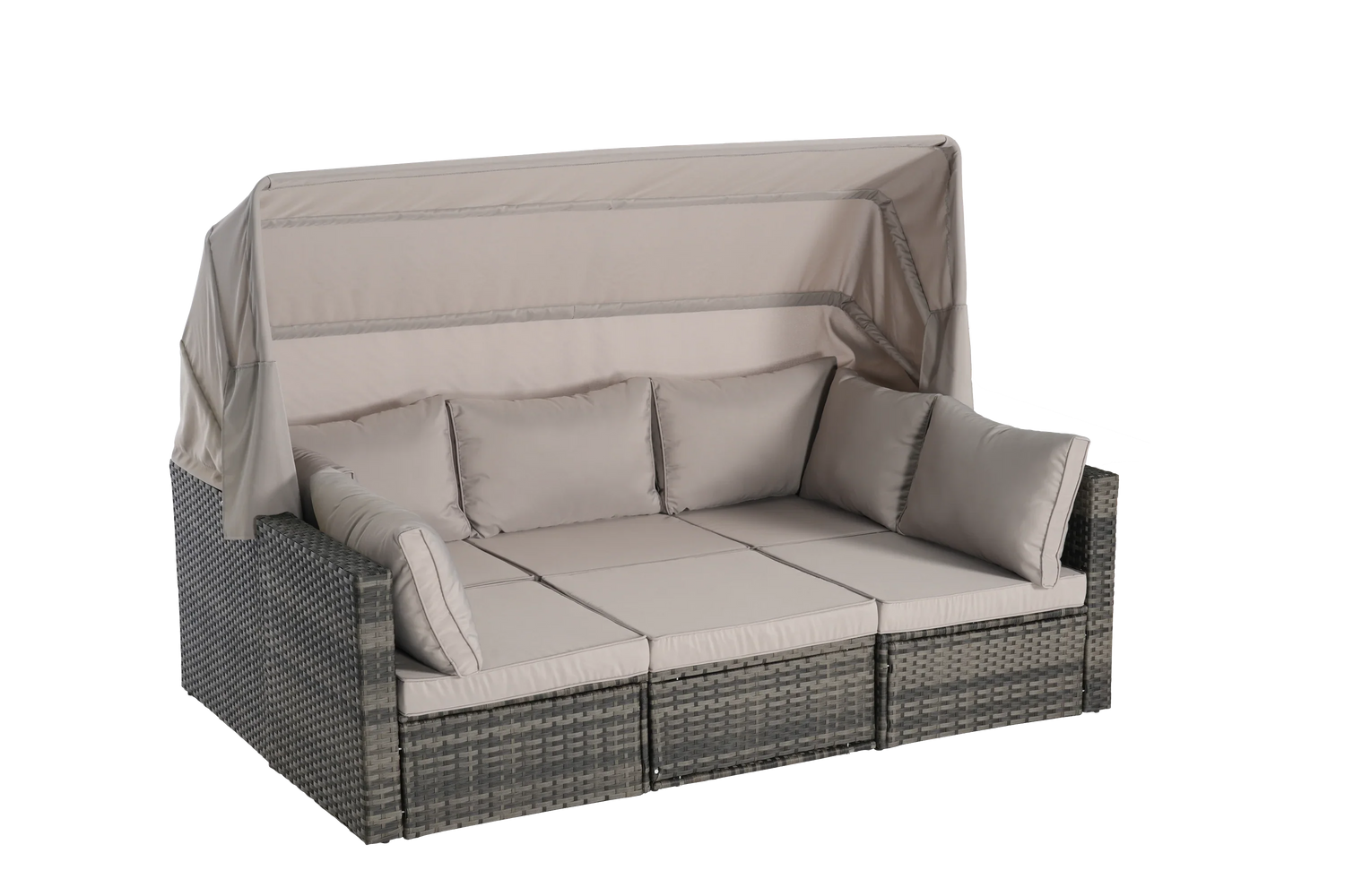Color: Gray Rattan +Light gray Cushion Product Size: 1*Canopied 3-seater sofa: 81.5*28.74*27.17 (59.06) 2*Armless Single Sofa: 28.74*24.8*27.17 inch 1*Coffee table: 24.8*24.8*12.6 inch Net weight: 94.8 lbs Gross weight: 103.62 lbs Single sofa Load bearing:380 LBS Cushion Thickness:3.2 inch Coffee table with tempered glass Features of PE rattan 100% hand-woven by professional worker to make it though and comfortable Weather resistant- can be put both indoor and outdoor; Chlorine resistant, salt resistant, suitable for swimming pool Good breathablity, good for our health Anti-UV- fadeless Eco-friendly, odorless Strong-durable Advantage: The advantage of outdoor garden furniture: 1. Material: High quality polyethylene rattan. 2. Frame: aluminum frame, power-coated, no rust. 3. Fabric: Sunproof or Sunbrella, up to your options. 4. Foam: Quick-dry foam, clean and comfortable. 5.Handcrafted:100% handwoven wicker. 6. Low after-sale rate Notice: 1 Don't tighten each screw at the beginning, advised to leave each screw a little loose till all of the screws are in, and then tighten all of them. 2 Manual measurement has been used 3 Items may slightly differ from photo in terms of color due to the lighting or your monitors display. 4 Take precautions during inclement weather conditions
