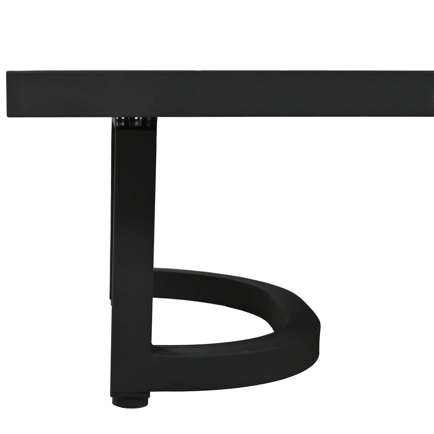 - Table top: Slatted rectangular surface with curved leg supports (steel construction shown).