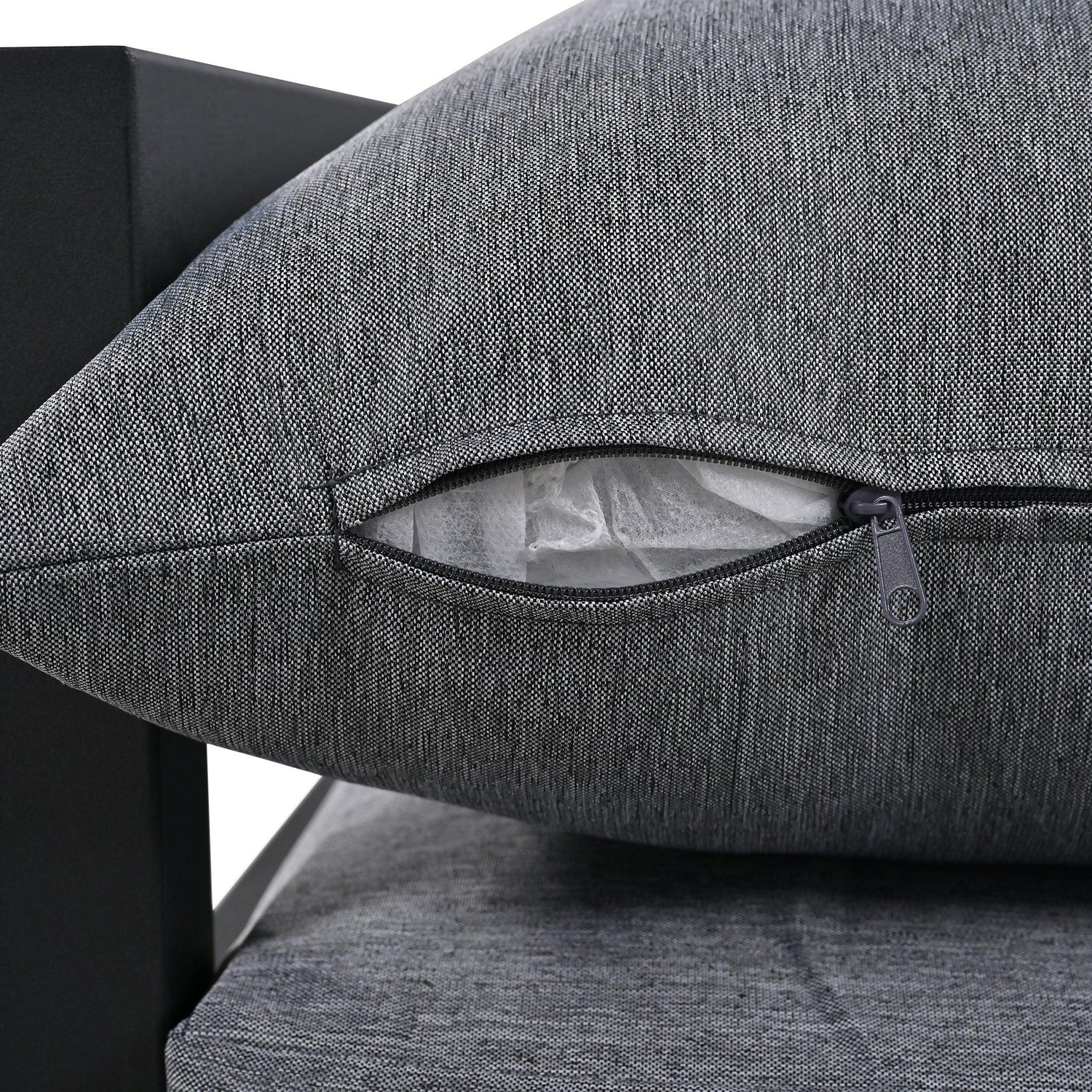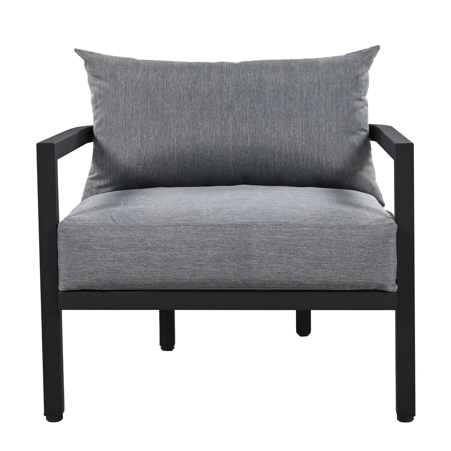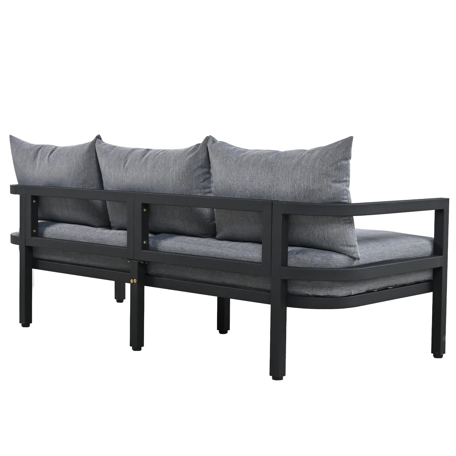 Pair this set with textured outdoor rugs, potted grasses, and matte black or natural wood accent pieces to soften the metal frame. Add low-profile outdoor lighting and side tables for evening entertaining. Because of its neutral light‑gray palette, the set coordinates well with warm wood tones or saturated accent pillows for contrast.
